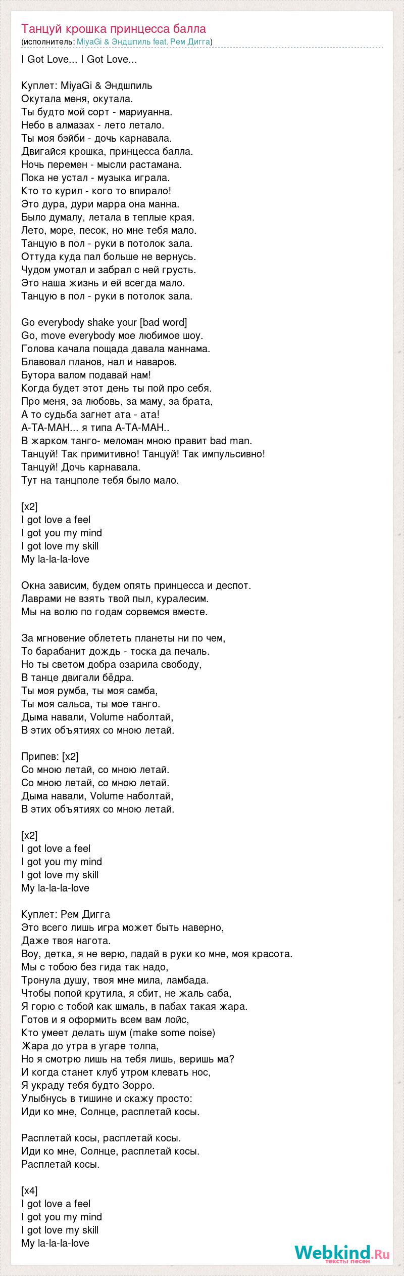 I Got Love... I Got Love... Куплет: MiyaGi & Эндшпиль Окутала меня, окутала. Ты будто мой сорт - мариуанна. Небо в алмазах - лето летало. Ты моя бэйби - дочь карнавала. Двигайся крошка, принцесса балла. Ночь перемен - мысли растамана. Пока не устал - музыка играла. Кто то курил - кого то впирало! Это дура, дури марра она манна. Было думалу, летала в теплые края. Лето, море, песок, но мне тебя мало. Танцую в пол - руки в потолок зала. Оттуда куда пал больше не вернусь. Чудом умотал и забрал с ней грусть. Это наша жизнь и ей всегда мало. Танцую в пол - руки в потолок зала. Go everybody shake your [bad word] Go, move everybody мое любимое шоу. Голова качала пощада давала маннама. Блавовал планов, нал и наваров. Бутора валом подавай нам! Когда будет этот день ты пой про себя. Про меня, за любовь, за маму, за брата, А то судьба загнет ата - ата! А-ТА-МАН... я типа А-ТА-МАН.. В жарком танго- меломан мною правит bad man. Танцуй! Так примитивно! Танцуй! Так импульсивно! Танцуй! Дочь карнавала. Тут на танцполе тебя было мало. [x2] I got love a feel I got you my mind I got love my skill My la-la-la-love Окна зависим, будем опять принцесса и деспот. Лаврами не взять твой пыл, куралесим. Мы на волю по годам сорвемся вместе. За мгновение облететь планеты ни по чем, То барабанит дождь - тоска да печаль. Но ты светом добра озарила свободу, В танце двигали бёдра. Ты моя румба, ты моя самба, Ты моя сальса, ты мое танго. Дыма навали, Volume наболтай, В этих объятиях со мною летай. Припев: [х2] Со мною летай, со мною летай. Со мною летай, со мною летай. Дыма навали, Volume наболтай, В этих объятиях со мною летай. [х2] I got love a feel I got you my mind I got love my skill My la-la-la-love Куплет: Рем Дигга Это всего лишь игра может быть наверно, Даже твоя нагота. Воу, детка, я не верю, падай в руки ко мне, моя красота. Мы с тобою без гида так надо, Тронула душу, твоя мне мила, ламбада. Чтобы попой крутила, я сбит, не жаль саба, Я горю с тобой как шмаль, в пабах такая жара. Готов и я оформить всем вам лойс, Кто умеет делать шум (make some noise) Жара до утра в угаре толпа, Но я смотрю лишь на тебя лишь, веришь ма? И когда станет клуб утром клевать нос, Я украду тебя будто Зорро. Улыбнусь в тишине и скажу просто: Иди ко мне, Солнце, расплетай косы. Расплетай косы, расплетай косы. Иди ко мне, Солнце, расплетай косы. Расплетай косы. [x4] I got love a feel I got you my mind I got love my skill My la-la-la-love
