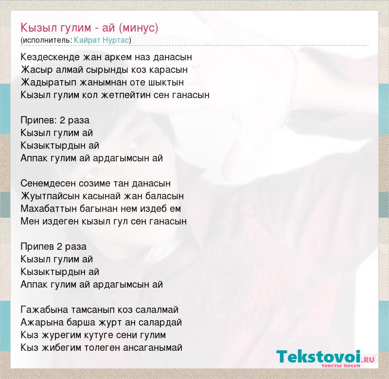 Кездескенде жан аркем наз данасын Жасыр алмай сырынды коз карасын Жадыратып жанымнан оте шыктын Кызыл гулим кол жетпейтин сен ганасын Припев: 2 раза Кызыл гулим ай Кызыктырдын ай Аппак гулим ай ардагымсын ай Сенемдесен созиме тан данасын Жуытпайсын касынай жан баласын Махабаттын багынан нем издеб ем Мен издеген кызыл гул сен ганасын Припев 2 раза Кызыл гулим ай Кызыктырдын ай Аппак гулим ай ардагымсын ай Гажабына тамсанып коз салалмай Ажарына барша журт ан салардай Кыз журегим кутуге сени гулим Кыз жибегим толеген ансаганымай