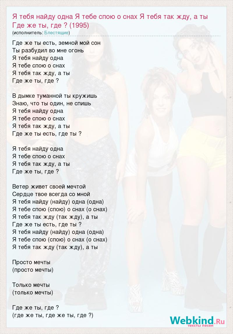 Где же ты есть, земной мой сон Ты разбудил во мне огонь Я тебя найду одна Я тебе спою о снах Я тебя так жду, а ты Где же ты, где ? В дымке туманной ты кружишь Знаю, что ты один, не спишь Я тебя найду одна Я тебе спою о снах Я тебя так жду, а ты Где же ты есть, где ты ? Я тебя найду одна Я тебе спою о снах Я тебя так жду, а ты Где же ты, где ? Ветер живет своей мечтой Сердце твое всегда со мной Я тебя найду (найду) одна (одна) Я тебе спою (спою) о снах (о снах) Я тебя так жду (так жду), а ты Где же ты есть, где ты ? Я тебя найду (найду) одна (одна) Я тебе спою (спою) о снах (о снах) Я тебя так жду (так жду), а ты Просто мечты (просто мечты) Только мечты (только мечты) Где же ты, где ? (где же ты, где же ты, где ?)