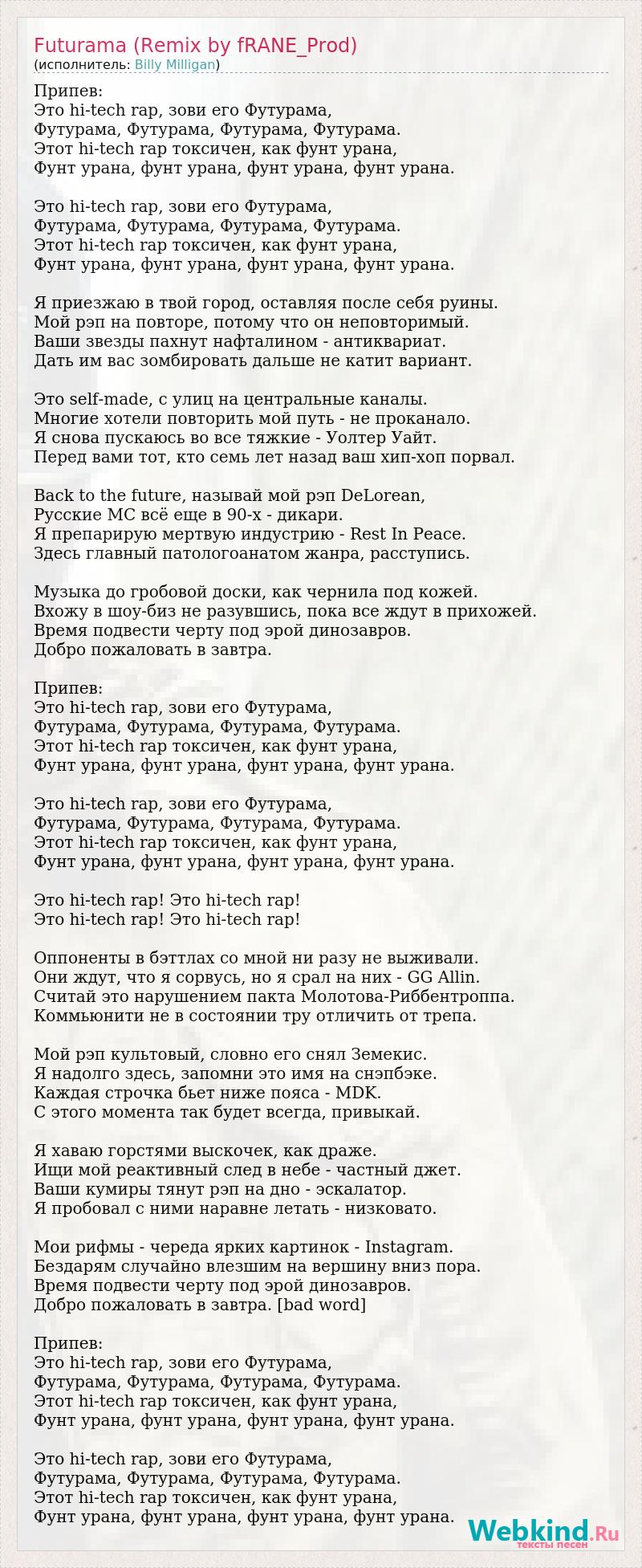 Припев: Это hi-tech rap, зови его Футурама, Футурама, Футурама, Футурама, Футурама. Этот hi-tech rap токсичен, как фунт урана, Фунт урана, фунт урана, фунт урана, фунт урана. Это hi-tech rap, зови его Футурама, Футурама, Футурама, Футурама, Футурама. Этот hi-tech rap токсичен, как фунт урана, Фунт урана, фунт урана, фунт урана, фунт урана. Я приезжаю в твой город, оставляя после себя руины. Мой рэп на повторе, потому что он неповторимый. Ваши звезды пахнут нафталином - антиквариат. Дать им вас зомбировать дальше не катит вариант. Это self-made, с улиц на центральные каналы. Многие хотели повторить мой путь - не проканало. Я снова пускаюсь во все тяжкие - Уолтер Уайт. Перед вами тот, кто семь лет назад ваш хип-хоп порвал. Back to the future, называй мой рэп DeLorean, Русские MC всё еще в 90-х - дикари. Я препарирую мертвую индустрию - Rest In Peace. Здесь главный патологоанатом жанра, расступись. Музыка до гробовой доски, как чернила под кожей. Вхожу в шоу-биз не разувшись, пока все ждут в прихожей. Время подвести черту под эрой динозавров. Добро пожаловать в завтра. Припев: Это hi-tech rap, зови его Футурама, Футурама, Футурама, Футурама, Футурама. Этот hi-tech rap токсичен, как фунт урана, Фунт урана, фунт урана, фунт урана, фунт урана. Это hi-tech rap, зови его Футурама, Футурама, Футурама, Футурама, Футурама. Этот hi-tech rap токсичен, как фунт урана, Фунт урана, фунт урана, фунт урана, фунт урана. Это hi-tech rap! Это hi-tech rap! Это hi-tech rap! Это hi-tech rap! Оппоненты в бэттлах со мной ни разу не выживали. Они ждут, что я сорвусь, но я срал на них - GG Allin. Считай это нарушением пакта Молотова-Риббентроппа. Коммьюнити не в состоянии тру отличить от трепа. Мой рэп культовый, словно его снял Земекис. Я надолго здесь, запомни это имя на снэпбэке. Каждая строчка бьет ниже пояса - MDK. С этого момента так будет всегда, привыкай. Я хаваю горстями выскочек, как драже. Ищи мой реактивный след в небе - частный джет. Ваши кумиры тянут рэп на дно - эскалатор. Я пробовал с ними наравне летать - низковато. Мои рифмы - череда ярких картинок - Instagram. Бездарям случайно влезшим на вершину вниз пора. Время подвести черту под эрой динозавров. Добро пожаловать в завтра. [bad word] Припев: Это hi-tech rap, зови его Футурама, Футурама, Футурама, Футурама, Футурама. Этот hi-tech rap токсичен, как фунт урана, Фунт урана, фунт урана, фунт урана, фунт урана. Это hi-tech rap, зови его Футурама, Футурама, Футурама, Футурама, Футурама. Этот hi-tech rap токсичен, как фунт урана, Фунт урана, фунт урана, фунт урана, фунт урана.