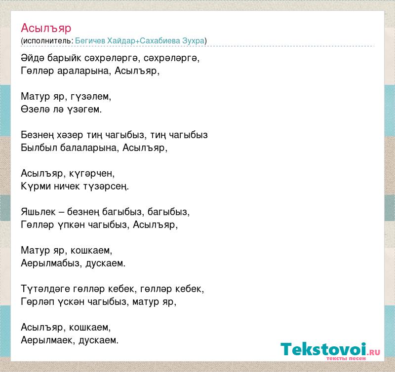 Әйдә барыйк сәхрәләргә, сәхрәләргә, Гөлләр араларына, Асылъяр, Матур яр, гүзәлем, Өзелә лә үзәгем. Безнең хәзер тиң чагыбыз, тиң чагыбыз Былбыл балаларына, Асылъяр, Асылъяр, күгәрчен, Күрми ничек түзәрсең. Яшьлек – безнең багыбыз, багыбыз, Гөлләр үпкән чагыбыз, Асылъяр, Матур яр, кошкаем, Аерылмабыз, дускаем. Түтәлдәге гөлләр кебек, гөлләр кебек, Гөрләп үскән чагыбыз, матур яр, Асылъяр, кошкаем, Аерылмаек, дускаем.