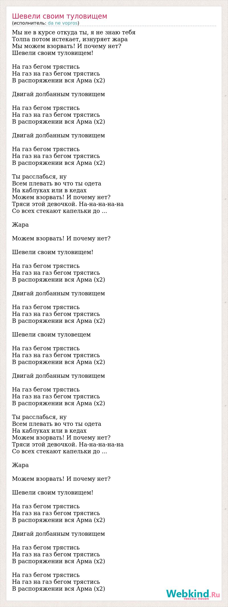 Мы не в курсе откуда ты, я не знаю тебя Толпа потом истекает, изнуряет жара Мы можем взорвать! И почему нет? Шевели своим туловищем! На газ бегом трястись На газ на газ бегом трястись В распоряжении вся Арма (x2) Двигай долбанным туловищем На газ бегом трястись На газ на газ бегом трястись В распоряжении вся Арма (x2) Двигай долбанным туловищем На газ бегом трястись На газ на газ бегом трястись В распоряжении вся Арма (x2) Ты расслабься, ну Всем плевать во что ты одета На каблуках или в кедах Можем взорвать! И почему нет? Тряси этой девочкой. На-на-на-на-на Со всех стекают капельки до ... Жара Можем взорвать! И почему нет? Шевели своим туловищем! На газ бегом трястись На газ на газ бегом трястись В распоряжении вся Арма (x2) Двигай долбанным туловищем На газ бегом трястись На газ на газ бегом трястись В распоряжении вся Арма (x2) Шевели своим туловещем На газ бегом трястись На газ на газ бегом трястись В распоряжении вся Арма (x2) Двигай долбанным туловищем На газ бегом трястись На газ на газ бегом трястись В распоряжении вся Арма (x2) Ты расслабься, ну Всем плевать во что ты одета На каблуках или в кедах Можем взорвать! И почему нет? Тряси этой девочкой. На-на-на-на-на Со всех стекают капельки до ... Жара Можем взорвать! И почему нет? Шевели своим туловищем! На газ бегом трястись На газ на газ бегом трястись В распоряжении вся Арма (x2) Двигай долбанным туловищем На газ бегом трястись На газ на газ бегом трястись В распоряжении вся Арма (x2) На газ бегом трястись На газ на газ бегом трястись В распоряжении вся Арма (x2)
