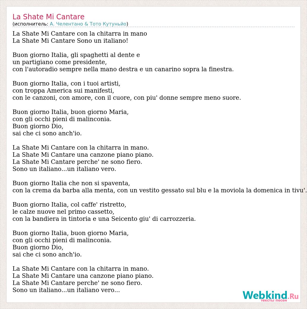 La Shate Mi Cantare con la chitarra in mano La Shate Mi Cantare Sono un italiano! Buon giorno Italia, gli spaghetti al dente e un partigiano come presidente, con l'autoradio sempre nella mano destra e un canarino sopra la finestra. Buon giorno Italia, con i tuoi artisti, con troppa America sui manifesti, con le canzoni, con amore, con il cuore, con piu' donne sempre meno suore. Buon giorno Italia, buon giorno Maria, con gli occhi pieni di malinconia. Buon giorno Dio, sai che ci sono anch'io. La Shate Mi Cantare con la chitarra in mano. La Shate Mi Cantare una canzone piano piano. La Shate Mi Cantare perche' ne sono fiero. Sono un italiano...un italiano vero. Buon giorno Italia che non si spaventa, con la crema da barba alla menta, con un vestito gessato sul blu e la moviola la domenica in tivu'. Buon giorno Italia, col caffe' ristretto, le calze nuove nel primo cassetto, con la bandiera in tintoria e una Seicento giu' di carrozzeria. Buon giorno Italia, buon giorno Maria, con gli occhi pieni di malinconia. Buon giorno Dio, sai che ci sono anch'io. La Shate Mi Cantare con la chitarra in mano. La Shate Mi Cantare una canzone piano piano. La Shate Mi Cantare perche' ne sono fiero. Sono un italiano...un italiano vero...