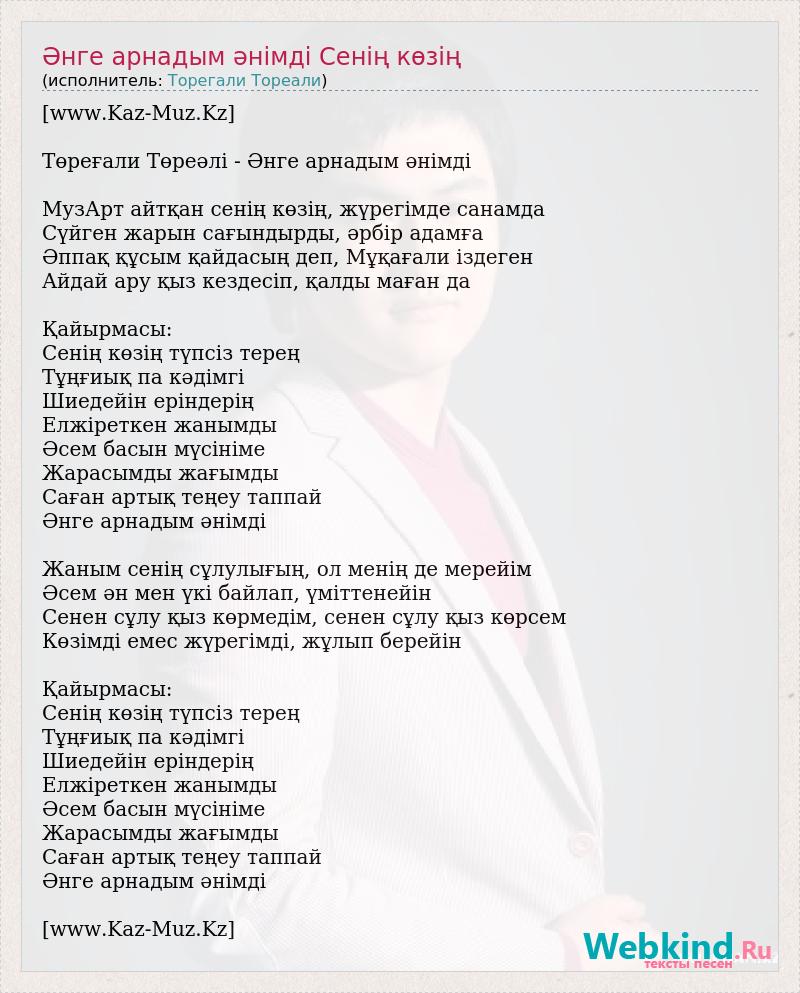[www.Kaz-Muz.Kz] Төреғали Төреәлі - Әнге арнадым әнімді МузАрт айтқан сенің көзің, жүрегімде санамда Сүйген жарын сағындырды, әрбір адамға Әппақ құсым қайдасың деп, Мұқағали іздеген Айдай ару қыз кездесіп, қалды маған да Қайырмасы: Сенің көзің түпсіз терең Тұңғиық па кәдімгі Шиедейін еріндерің Елжіреткен жанымды Әсем басын мүсініме Жарасымды жағымды Саған артық теңеу таппай Әнге арнадым әнімді Жаным сенің сұлулығың, ол менің де мерейім Әсем ән мен үкі байлап, үміттенейін Сенен сұлу қыз көрмедім, сенен сұлу қыз көрсем Көзімді емес жүрегімді, жұлып берейін Қайырмасы: Сенің көзің түпсіз терең Тұңғиық па кәдімгі Шиедейін еріндерің Елжіреткен жанымды Әсем басын мүсініме Жарасымды жағымды Саған артық теңеу таппай Әнге арнадым әнімді [www.Kaz-Muz.Kz]
