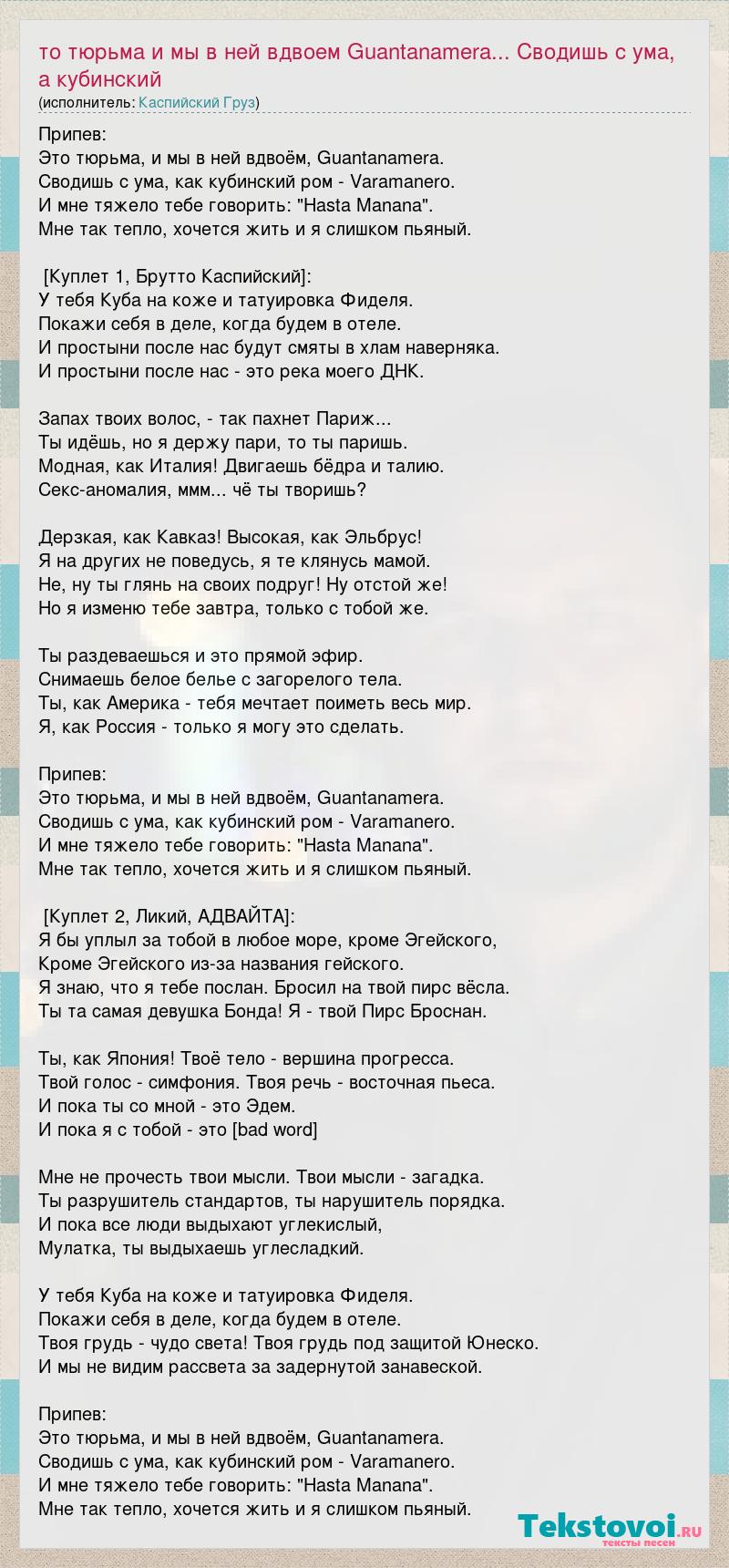 Припев: Это тюрьма, и мы в ней вдвоём, Guantanamera. Сводишь с ума, как кубинский ром - Varamanero. И мне тяжело тебе говорить: "Hasta Manana". Мне так тепло, хочется жить и я слишком пьяный. [Куплет 1, Брутто Каспийский]: У тебя Куба на коже и татуировка Фиделя. Покажи себя в деле, когда будем в отеле. И простыни после нас будут смяты в хлам наверняка. И простыни после нас - это река моего ДНК. Запах твоих волос, - так пахнет Париж... Ты идёшь, но я держу пари, то ты паришь. Модная, как Италия! Двигаешь бёдра и талию. Секс-аномалия, ммм... чё ты творишь? Дерзкая, как Кавказ! Высокая, как Эльбрус! Я на других не поведусь, я те клянусь мамой. Не, ну ты глянь на своих подруг! Ну отстой же! Но я изменю тебе завтра, только с тобой же. Ты раздеваешься и это прямой эфир. Снимаешь белое белье с загорелого тела. Ты, как Америка - тебя мечтает поиметь весь мир. Я, как Россия - только я могу это сделать. Припев: Это тюрьма, и мы в ней вдвоём, Guantanamera. Сводишь с ума, как кубинский ром - Varamanero. И мне тяжело тебе говорить: "Hasta Manana". Мне так тепло, хочется жить и я слишком пьяный. [Куплет 2, Ликий, АДВАЙТА]: Я бы уплыл за тобой в любое море, кроме Эгейского, Кроме Эгейского из-за названия гейского. Я знаю, что я тебе послан. Бросил на твой пирс вёсла. Ты та самая девушка Бонда! Я - твой Пирс Броснан. Ты, как Япония! Твоё тело - вершина прогресса. Твой голос - симфония. Твоя речь - восточная пьеса. И пока ты со мной - это Эдем. И пока я с тобой - это [bad word] Мне не прочесть твои мысли. Твои мысли - загадка. Ты разрушитель стандартов, ты нарушитель порядка. И пока все люди выдыхают углекислый, Мулатка, ты выдыхаешь углесладкий. У тебя Куба на коже и татуировка Фиделя. Покажи себя в деле, когда будем в отеле. Твоя грудь - чудо света! Твоя грудь под защитой Юнеско. И мы не видим рассвета за задернутой занавеской. Припев: Это тюрьма, и мы в ней вдвоём, Guantanamera. Сводишь с ума, как кубинский ром - Varamanero. И мне тяжело тебе говорить: "Hasta Manana". Мне так тепло, хочется жить и я слишком пьяный.