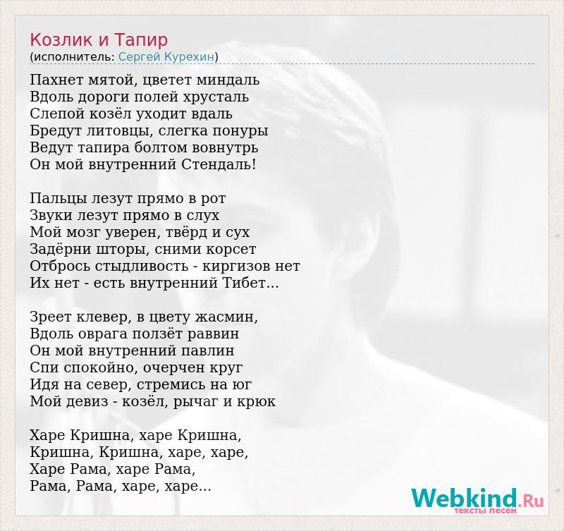 Пахнет мятой, цветет миндаль Вдоль дороги полей хрусталь Слепой козёл уходит вдаль Бредут литовцы, слегка понуры Ведут тапира болтом вовнутрь Он мой внутренний Стендаль! Пальцы лезут прямо в рот Звуки лезут прямо в слух Мой мозг уверен, твёрд и сух Задёрни шторы, сними корсет Отбрось стыдливость - киргизов нет Их нет - есть внутренний Тибет... Зреет клевер, в цвету жасмин, Вдоль оврага ползёт раввин Он мой внутренний павлин Спи спокойно, очерчен круг Идя на север, стремись на юг Мой девиз - козёл, рычаг и крюк Харе Кришна, харе Кришна, Кришна, Кришна, харе, харе, Харе Рама, харе Рама, Рама, Рама, харе, харе...