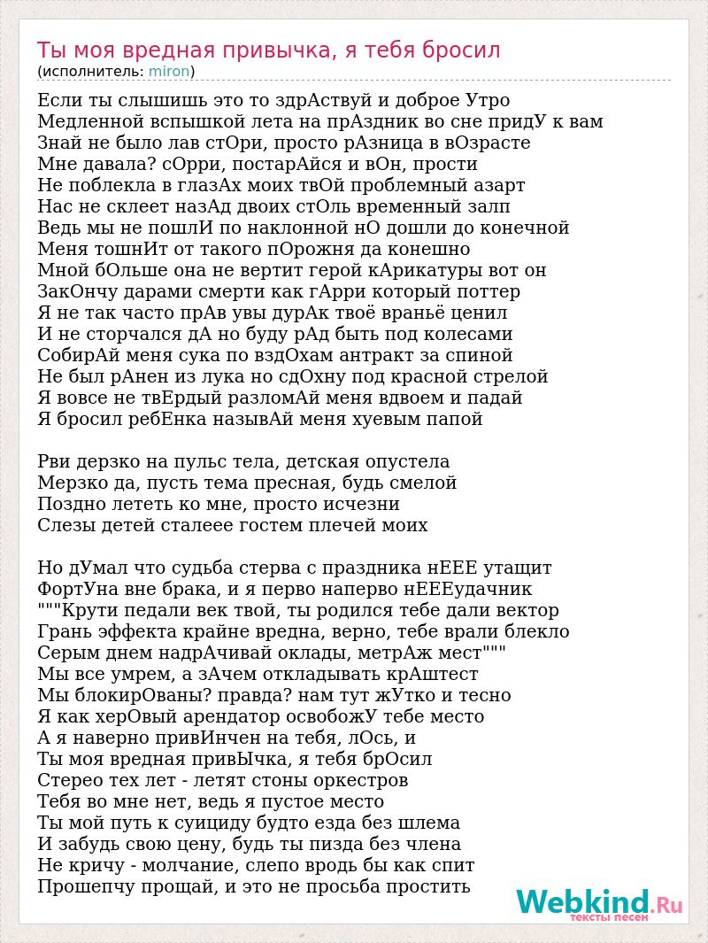 Если ты слышишь это то здрАствуй и доброе Утро Медленной вспышкой лета на прАздник во сне придУ к вам Знай не было лав стОри, просто рАзница в вОзрасте Мне давала? сОрри, постарАйся и вОн, прости Не поблекла в глазАх моих твОй проблемный азарт Нас не склеет назАд двоих стОль временный залп Ведь мы не пошлИ по наклонной нО дошли до конечной Меня тошнИт от такого пОрожня да конешно Мной бОльше она не вертит герой кАрикатуры вот он ЗакОнчу дарами смерти как гАрри который поттер Я не так часто прАв увы дурАк твоё враньё ценил И не сторчался дА но буду рАд быть под колесами СобирАй меня сука по вздОхам антракт за спиной Не был рАнен из лука но сдОхну под красной стрелой Я вовсе не твЕрдый разломАй меня вдвоем и падай Я бросил ребЕнка назывАй меня хуевым папой Рви дерзко на пульс тела, детская опустела Мерзко да, пусть тема пресная, будь смелой Поздно лететь ко мне, просто исчезни Слезы детей сталеее гостем плечей моих Но дУмал что судьба стерва с праздника нЕЕЕ утащит ФортУна вне брака, и я перво наперво нЕЕЕудачник """Крути педали век твой, ты родился тебе дали вектор Грань эффекта крайне вредна, верно, тебе врали блекло Серым днем надрАчивай оклады, метрАж мест""" Мы все умрем, а зАчем откладывать крАштест Мы блокирОваны? правда? нам тут жУтко и тесно Я как херОвый арендатор освобожУ тебе место А я наверно привИнчен на тебя, лОсь, и Ты моя вредная привЫчка, я тебя брОсил Стерео тех лет - летят стоны оркестров Тебя во мне нет, ведь я пустое место Ты мой путь к суициду будто езда без шлема И забудь свою цену, будь ты пизда без члена Не кричу - молчание, слепо вродь бы как спит Прошепчу прощай, и это не просьба простить