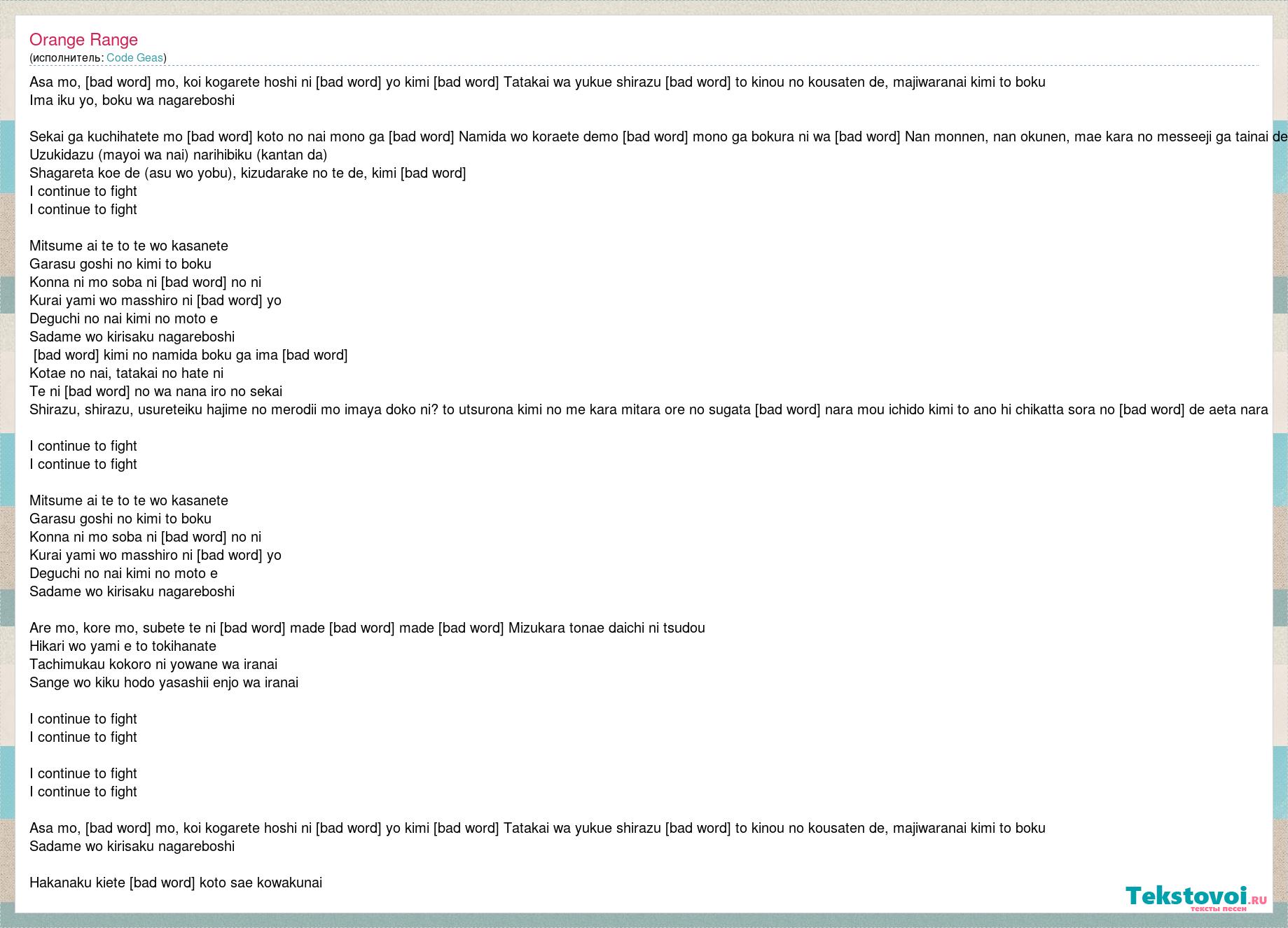 Asa mo, yoru mo, koi kogarete hoshi ni naru yo kimi mamoru Tatakai wa yukue shirazu [bad word] to kinou no kousaten de, majiwaranai kimi to boku Ima iku yo, boku wa nagareboshi Sekai ga kuchihatete mo kawaru koto no nai mono ga aru Namida wo koraete demo mamorubeki mono ga bokura ni wa aru Nan monnen, nan okunen, mae kara no messeeji ga tainai de Uzukidazu (mayoi wa nai) narihibiku (kantan da) Shagareta koe de (asu wo yobu), kizudarake no te de, kimi mamoru I continue to fight I continue to fight Mitsume ai te to te wo kasanete Garasu goshi no kimi to boku Konna ni mo soba ni iru no ni Kurai yami wo masshiro ni someru yo Deguchi no nai kimi no moto e Sadame wo kirisaku nagareboshi Afureru kimi no namida boku ga ima ubaisaru Kotae no nai, tatakai no hate ni Te ni [bad word] no wa nana iro no sekai Shirazu, shirazu, usureteiku hajime no merodii mo imaya doko ni? to utsurona kimi no me kara mitara ore no sugata Dekiru nara mou ichido kimi to ano hi chikatta sora no [bad word] de aeta nara I continue to fight I continue to fight Mitsume ai te to te wo kasanete Garasu goshi no kimi to boku Konna ni mo soba ni iru no ni Kurai yami wo masshiro ni someru yo Deguchi no nai kimi no moto e Sadame wo kirisaku nagareboshi Are mo, kore mo, subete te ni ireru made Kuchihateru made tachitsudzukeru Mizukara tonae daichi ni tsudou Hikari wo yami e to tokihanate Tachimukau kokoro ni yowane wa iranai Sange wo kiku hodo yasashii enjo wa iranai I continue to fight I continue to fight I continue to fight I continue to fight Asa mo, yoru mo, koi kogarete hoshi ni naru yo kimi mamoru Tatakai wa yukue shirazu [bad word] to kinou no kousaten de, majiwaranai kimi to boku Sadame wo kirisaku nagareboshi Hakanaku kiete nakunaru koto sae kowakunai