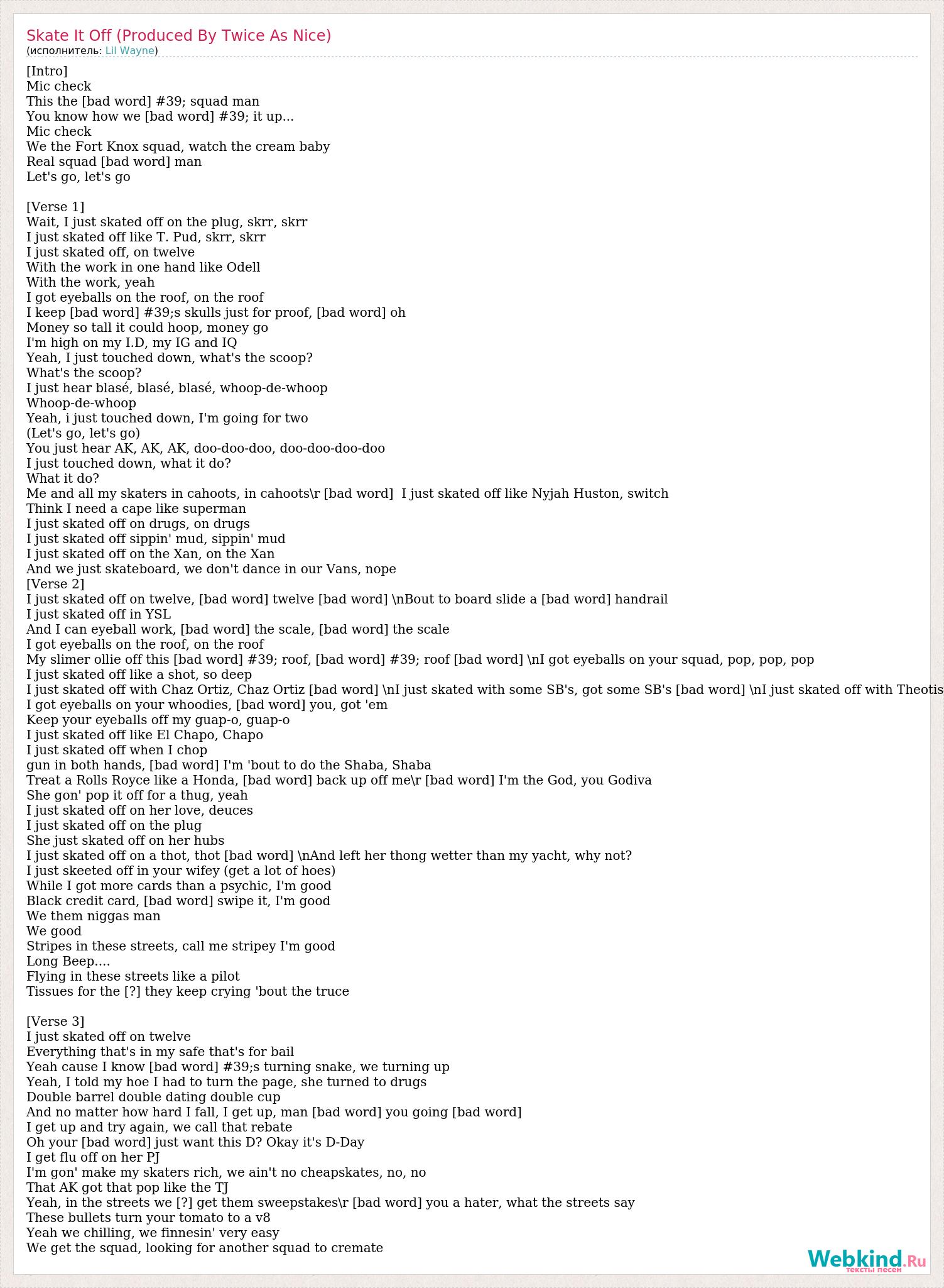 [Intro] Mic check This the [bad word] #39; squad man You know how we [bad word] #39; it up... Mic check We the Fort Knox squad, watch the cream baby Real squad [bad word] man Let's go, let's go [Verse 1] Wait, I just skated off on the plug, skrr, skrr I just skated off like T. Pud, skrr, skrr I just skated off, on twelve With the work in one hand like Odell With the work, yeah I got eyeballs on the roof, on the roof I keep [bad word] #39;s skulls just for proof, [bad word] oh Money so tall it could hoop, money go I'm high on my I.D, my IG and IQ Yeah, I just touched down, what's the scoop? What's the scoop? I just hear blasé, blasé, blasé, whoop-de-whoop Whoop-de-whoop Yeah, i just touched down, I'm going for two (Let's go, let's go) You just hear AK, AK, AK, doo-doo-doo, doo-doo-doo-doo I just touched down, what it do? What it do? Me and all my skaters in cahoots, in cahoots\r [bad word] I just skated off like Nyjah Huston, switch Think I need a cape like superman I just skated off on drugs, on drugs I just skated off sippin' mud, sippin' mud I just skated off on the Xan, on the Xan And we just skateboard, we don't dance in our Vans, nope [Verse 2] I just skated off on twelve, [bad word] twelve [bad word] \nBout to board slide a [bad word] handrail I just skated off in YSL And I can eyeball work, [bad word] the scale, [bad word] the scale I got eyeballs on the roof, on the roof My slimer ollie off this [bad word] #39; roof, [bad word] #39; roof [bad word] \nI got eyeballs on your squad, pop, pop, pop I just skated off like a shot, so deep I just skated off with Chaz Ortiz, Chaz Ortiz [bad word] \nI just skated with some SB's, got some SB's [bad word] \nI just skated off with Theotis I got eyeballs on your whoodies, [bad word] you, got 'em Keep your eyeballs off my guap-o, guap-o I just skated off like El Chapo, Chapo I just skated off when I chop gun in both hands, [bad word] I'm 'bout to do the Shaba, Shaba Treat a Rolls Royce like a Honda, [bad word] back up off me\r [bad word] I'm the God, you Godiva She gon' pop it off for a thug, yeah I just skated off on her love, deuces I just skated off on the plug She just skated off on her hubs I just skated off on a thot, thot [bad word] \nAnd left her thong wetter than my yacht, why not? I just skeeted off in your wifey (get a lot of hoes) While I got more cards than a psychic, I'm good Black credit card, [bad word] swipe it, I'm good We them niggas man We good Stripes in these streets, call me stripey I'm good Long Beep.... Flying in these streets like a pilot Tissues for the [?] they keep crying 'bout the truce [Verse 3] I just skated off on twelve Everything that's in my safe that's for bail Yeah cause I know [bad word] #39;s turning snake, we turning up Yeah, I told my hoe I had to turn the page, she turned to drugs Double barrel double dating double cup And no matter how hard I fall, I get up, man [bad word] you going [bad word] I get up and try again, we call that rebate Oh your [bad word] just want this D? Okay it's D-Day I get flu off on her PJ I'm gon' make my skaters rich, we ain't no cheapskates, no, no That AK got that pop like the TJ Yeah, in the streets we [?] get them sweepstakes\r [bad word] you a hater, what the streets say These bullets turn your tomato to a v8 Yeah we chilling, we finnesin' very easy We get the squad, looking for another squad to cremate