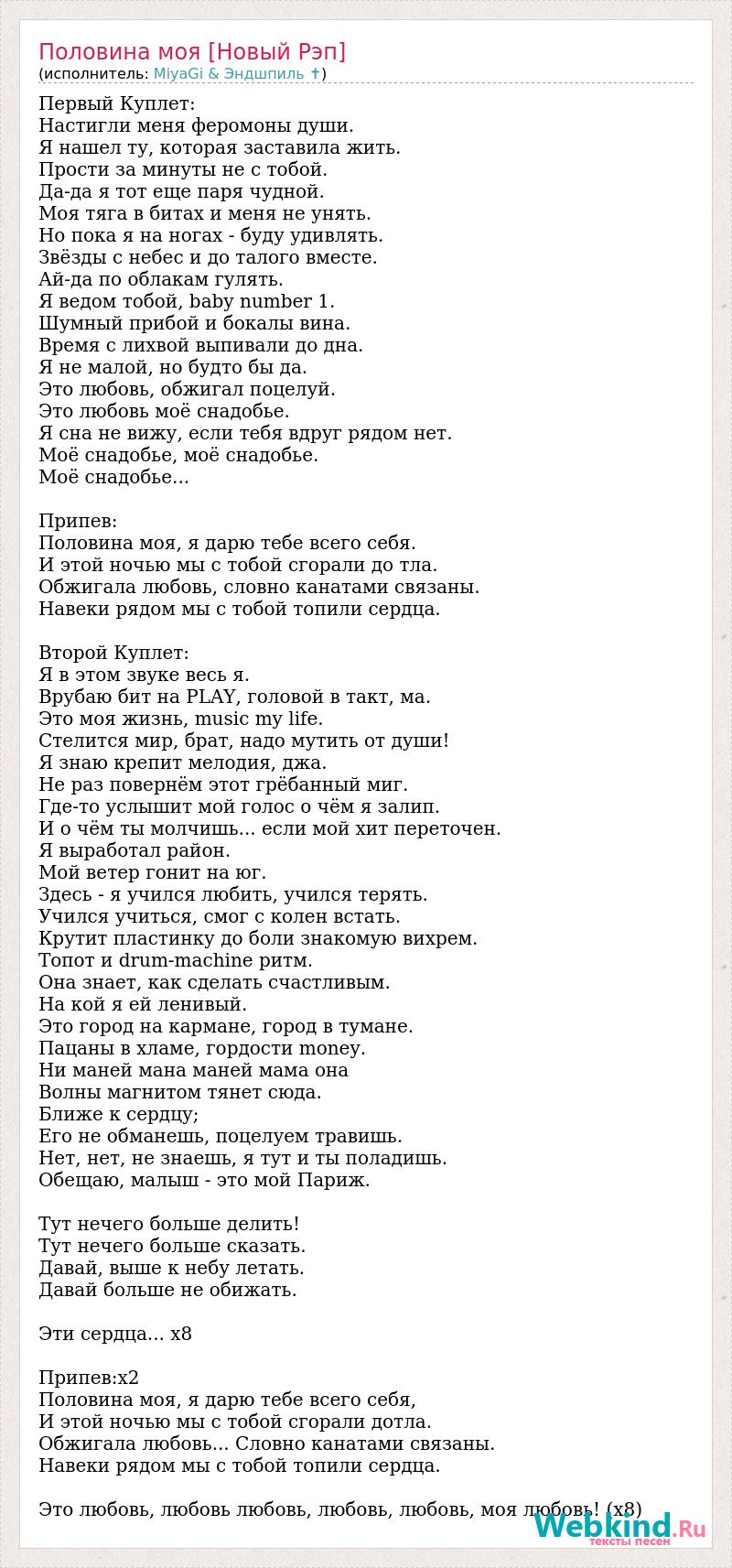 Первый Куплет: Настигли меня феромоны души. Я нашел ту, которая заставила жить. Прости за минуты не с тобой. Да-да я тот еще паря чудной. Моя тяга в битах и меня не унять. Но пока я на ногах - буду удивлять. Звёзды с небес и до талого вместе. Ай-да по облакам гулять. Я ведом тобой, baby number 1. Шумный прибой и бокалы вина. Время с лихвой выпивали до дна. Я не малой, но будто бы да. Это любовь, обжигал поцелуй. Это любовь моё снадобье. Я сна не вижу, если тебя вдруг рядом нет. Моё снадобье, моё снадобье. Моё снадобье... Припев: Половина моя, я дарю тебе всего себя. И этой ночью мы с тобой сгорали до тла. Обжигала любовь, словно канатами связаны. Навеки рядом мы с тобой топили сердца. Второй Куплет: Я в этом звуке весь я. Врубаю бит на PLAY, головой в такт, ма. Это моя жизнь, music my life. Стелится мир, брат, надо мутить от души! Я знаю крепит мелодия, джа. Не раз повернём этот грёбанный миг. Где-то услышит мой голос о чём я залип. И о чём ты молчишь... если мой хит переточен. Я выработал район. Мой ветер гонит на юг. Здесь - я учился любить, учился терять. Учился учиться, смог с колен встать. Крутит пластинку до боли знакомую вихрем. Топот и drum-machine ритм. Она знает, как сделать счастливым. На кой я ей ленивый. Это город на кармане, город в тумане. Пацаны в хламе, гордости money. Ни маней мана маней мама она Волны магнитом тянет сюда. Ближе к сердцу; Его не обманешь, поцелуем травишь. Нет, нет, не знаешь, я тут и ты поладишь. Обещаю, малыш - это мой Париж. Тут нечего больше делить! Тут нечего больше сказать. Давай, выше к небу летать. Давай больше не обижать. Эти сердца... x8 Припев:x2 Половина моя, я дарю тебе всего себя, И этой ночью мы с тобой сгорали дотла. Обжигала любовь... Словно канатами связаны. Навеки рядом мы с тобой топили сердца. Это любовь, любовь любовь, любовь, любовь, моя любовь! (х8)