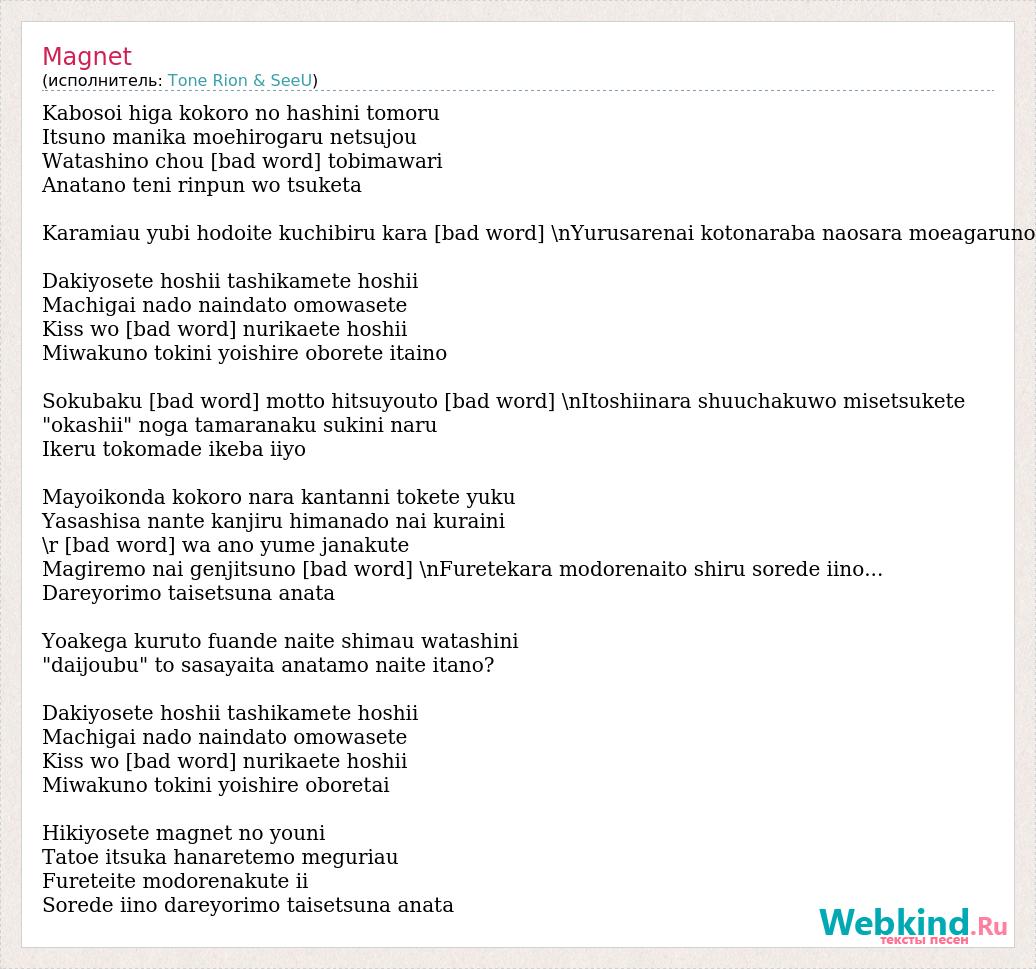 Kabosoi higa kokoro no hashini tomoru Itsuno manika moehirogaru netsujou Watashino chou [bad word] tobimawari Anatano teni rinpun wo tsuketa Karamiau yubi hodoite kuchibiru kara [bad word] \nYurusarenai kotonaraba naosara moeagaruno Dakiyosete hoshii tashikamete hoshii Machigai nado naindato omowasete Kiss wo [bad word] nurikaete hoshii Miwakuno tokini yoishire oborete itaino Sokubaku [bad word] motto hitsuyouto [bad word] \nItoshiinara shuuchakuwo misetsukete "okashii" noga tamaranaku sukini naru Ikeru tokomade ikeba iiyo Mayoikonda kokoro nara kantanni tokete yuku Yasashisa nante kanjiru himanado nai kuraini \r [bad word] wa ano yume janakute Magiremo nai genjitsuno [bad word] \nFuretekara modorenaito shiru sorede iino... Dareyorimo taisetsuna anata Yoakega kuruto fuande naite shimau watashini "daijoubu" to sasayaita anatamo naite itano? Dakiyosete hoshii tashikamete hoshii Machigai nado naindato omowasete Kiss wo [bad word] nurikaete hoshii Miwakuno tokini yoishire oboretai Hikiyosete magnet no youni Tatoe itsuka hanaretemo meguriau Fureteite modorenakute ii Sorede iino dareyorimo taisetsuna anata
