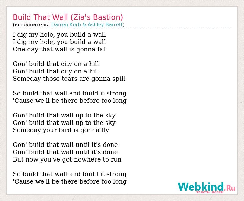 I dig my hole, you build a wall I dig my hole, you build a wall One day that wall is gonna fall Gon' build that city on a hill Gon' build that city on a hill Someday those tears are gonna spill So build that wall and build it strong 'Cause we'll be there before too long Gon' build that wall up to the sky Gon' build that wall up to the sky Someday your bird is gonna fly Gon' build that wall until it's done Gon' build that wall until it's done But now you've got nowhere to run So build that wall and build it strong 'Cause we'll be there before too long