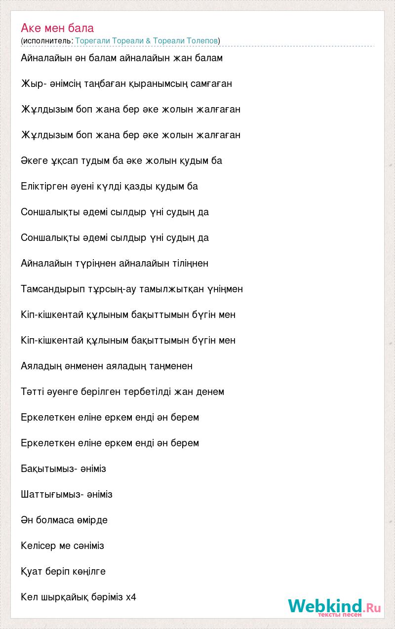 Айналайын ән балам айналайын жан балам Жыр- әнімсің таңбаған қыранымсың самғаған Жұлдызым боп жана бер әке жолын жалғаған Жұлдызым боп жана бер әке жолын жалғаған Әкеге ұқсап тудым ба әке жолын қудым ба Еліктірген әуені күлді қазды қудым ба Соншалықты әдемі сылдыр үні судың да Соншалықты әдемі сылдыр үні судың да Айналайын түріңнен айналайын тіліңнен Тамсандырып тұрсың-ау тамылжытқан үніңмен Кіп-кішкентай құлыным бақыттымын бүгін мен Кіп-кішкентай құлыным бақыттымын бүгін мен Аяладың әнменен аяладың таңменен Тәтті әуенге берілген тербетілді жан денем Еркелеткен еліне еркем енді ән берем Еркелеткен еліне еркем енді ән берем Бақытымыз- әніміз Шаттығымыз- әніміз Ән болмаса өмірде Келісер ме сәніміз Қуат беріп көңілге Кел шырқайық бәріміз х4