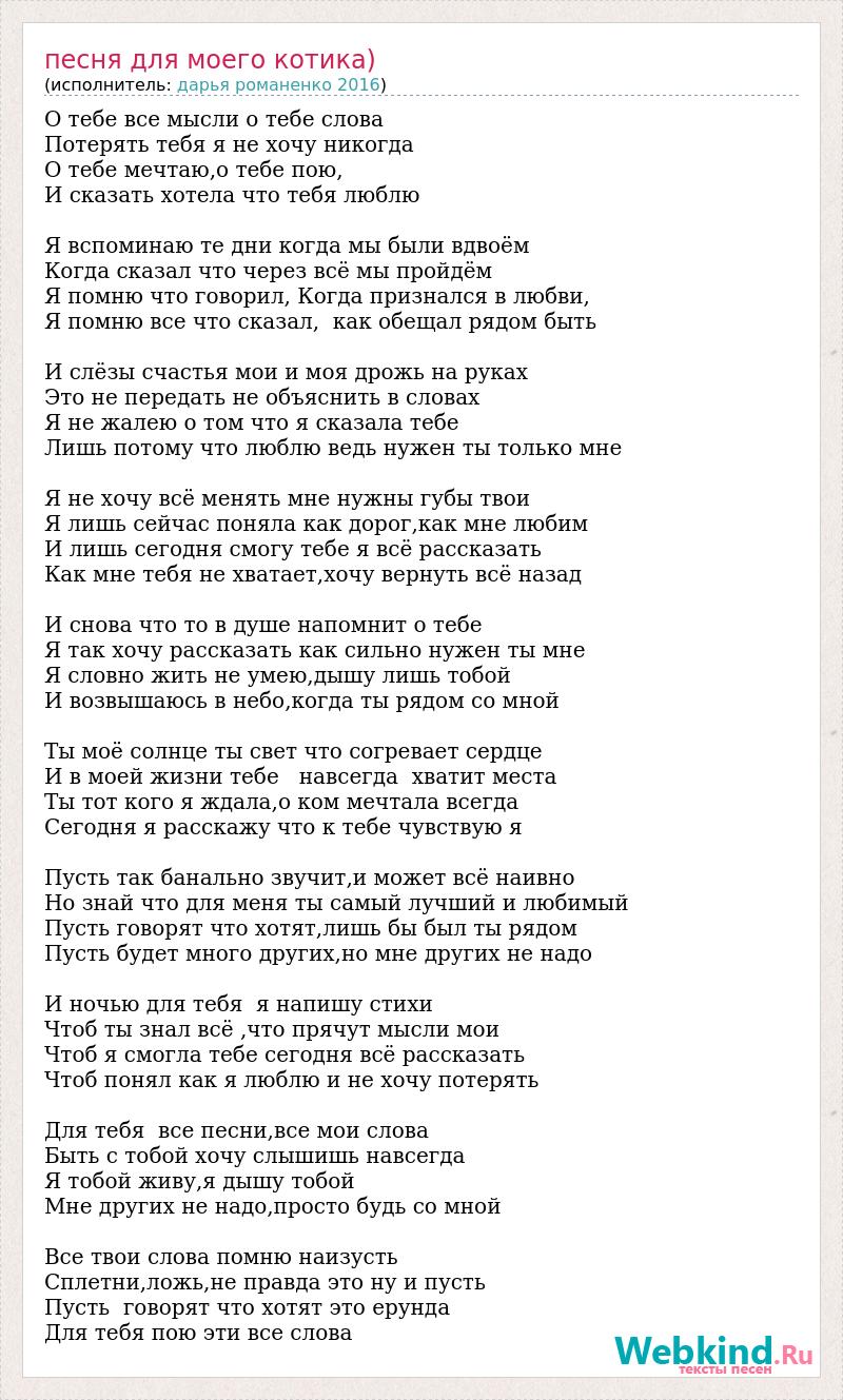 О тебе все мысли о тебе слова Потерять тебя я не хочу никогда О тебе мечтаю,о тебе пою, И сказать хотела что тебя люблю Я вспоминаю те дни когда мы были вдвоём Когда сказал что через всё мы пройдём Я помню что говорил, Когда признался в любви, Я помню все что сказал, как обещал рядом быть И слёзы счастья мои и моя дрожь на руках Это не передать не объяснить в словах Я не жалею о том что я сказала тебе Лишь потому что люблю ведь нужен ты только мне Я не хочу всё менять мне нужны губы твои Я лишь сейчас поняла как дорог,как мне любим И лишь сегодня смогу тебе я всё рассказать Как мне тебя не хватает,хочу вернуть всё назад И снова что то в душе напомнит о тебе Я так хочу рассказать как сильно нужен ты мне Я словно жить не умею,дышу лишь тобой И возвышаюсь в небо,когда ты рядом со мной Ты моё солнце ты свет что согревает сердце И в моей жизни тебе навсегда хватит места Ты тот кого я ждала,о ком мечтала всегда Сегодня я расскажу что к тебе чувствую я Пусть так банально звучит,и может всё наивно Но знай что для меня ты самый лучший и любимый Пусть говорят что хотят,лишь бы был ты рядом Пусть будет много других,но мне других не надо И ночью для тебя я напишу стихи Чтоб ты знал всё ,что прячут мысли мои Чтоб я смогла тебе сегодня всё рассказать Чтоб понял как я люблю и не хочу потерять Для тебя все песни,все мои слова Быть с тобой хочу слышишь навсегда Я тобой живу,я дышу тобой Мне других не надо,просто будь со мной Все твои слова помню наизусть Сплетни,ложь,не правда это ну и пусть Пусть говорят что хотят это ерунда Для тебя пою эти все слова