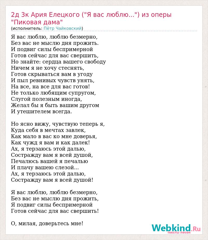 Я вас люблю, люблю безмерно, Без вас не мыслю дня прожить. И подвиг силы беспримерной Готов сейчас для вас свершить, Но знайте: сердца вашего свободу Ничем я не хочу стеснять, Готов скрываться вам в угоду И пыл ревнивых чувств унять, На все, на все для вас готов! Не только любящим супругом, Слугой полезным иногда, Желал бы я быть вашим другом И утешителем всегда. Но ясно вижу, чувствую теперь я, Куда себя в мечтах завлек, Как мало в вас ко мне доверья, Как чужд я вам и как далек! Ах, я терзаюсь этой далью, Состражду вам я всей душой, Печалюсь вашей я печалью И плачу вашею слезой... Ах, я терзаюсь этой далью, Состражду вам я всей душой! Я вас люблю, люблю безмерно, Без вас не мыслю дня прожить, Я подвиг силы беспримерной Готов сейчас для вас свершить! О, милая, доверьтесь мне!