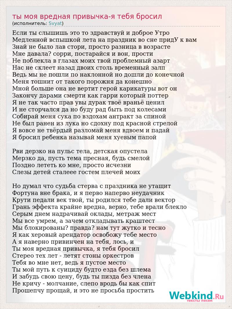 Если ты слышишь это то здравствуй и доброе Утро Медленной вспышкой лета на праздник во сне придУ к вам Знай не было лав стори, просто разница в возрасте Мне давала? сорри, постарайся и вон, прости Не поблекла в глазах моих твой проблемный азарт Нас не склеет назад двоих столь временный залп Ведь мы не пошли по наклонной но дошли до конечной Меня тошнит от такого порожня да конешно Мной больше она не вертит герой карикатуры вот он Закончу дарами смерти как гарри который поттер Я не так часто прав увы дурак твоё враньё ценил И не сторчался да но буду рад быть под колесами Собирай меня сука по вздохам антракт за спиной Не был ранен из лука но сдохну под красной стрелой Я вовсе не твёрдый разломай меня вдвоем и падай Я бросил ребенка называй меня хуевым папой Рви дерзко на пульс тела, детская опустела Мерзко да, пусть тема пресная, будь смелой Поздно лететь ко мне, просто исчезни Слезы детей сталеее гостем плечей моих Но думал что судьба стерва с праздника не утащит Фортуна вне брака, и я перво наперво неудачник Крути педали век твой, ты родился тебе дали вектор Грань эффекта крайне вредна, верно, тебе врали блекло Серым днем надрачивай оклады, метраж мест Мы все умрем, а зачем откладывать краштест Мы блокированы? правда? нам тут жутко и тесно Я как херовый арендатор освобожу тебе место А я наверно привинчен на тебя, лось, и Ты моя вредная привычка, я тебя бросил Стерео тех лет - летят стоны оркестров Тебя во мне нет, ведь я пустое место Ты мой путь к суициду будто езда без шлема И забудь свою цену, будь ты пизда без члена Не кричу - молчание, слепо вродь бы как спит Прошепчу прощай, и это не просьба простить
