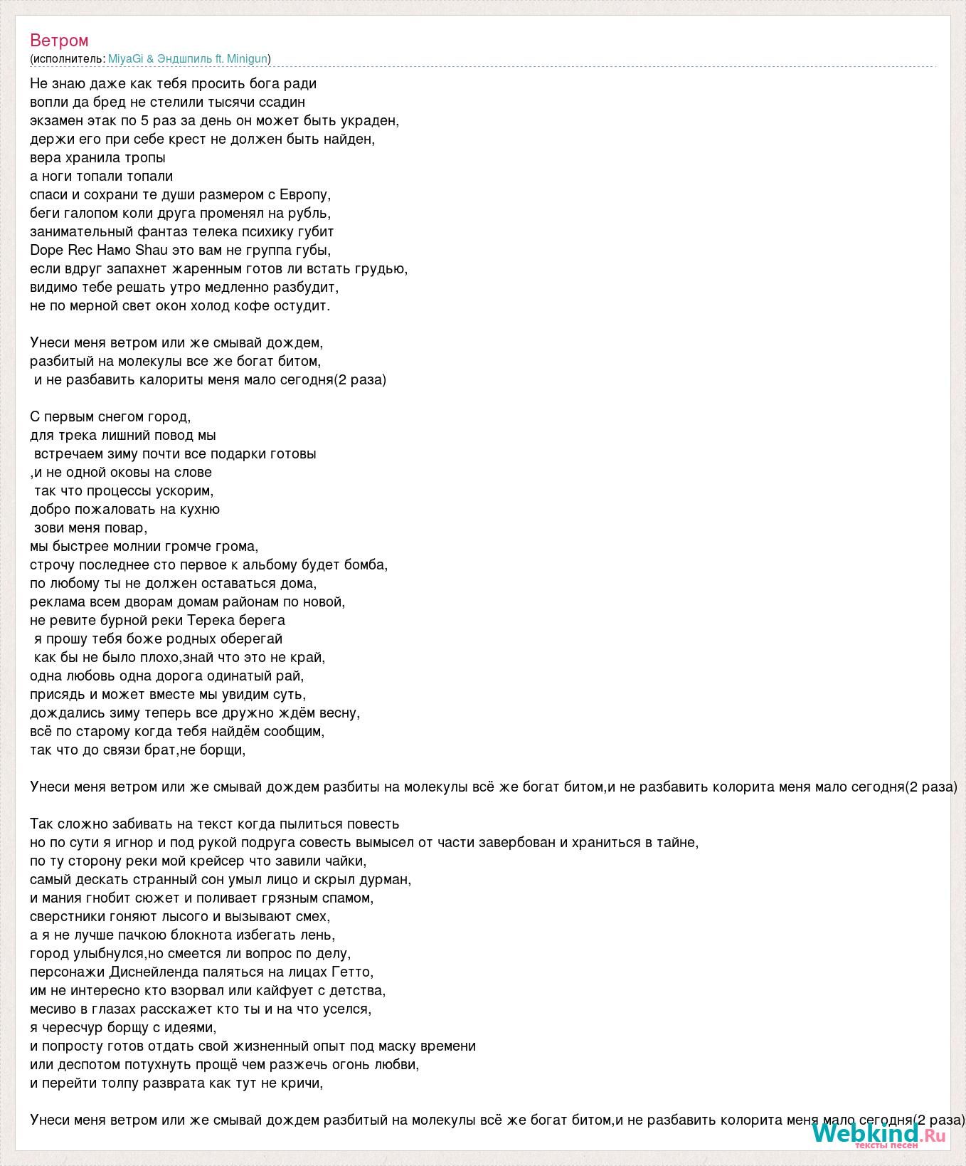 Не знаю даже как тебя просить бога ради вопли да бред не стелили тысячи ссадин экзамен этак по 5 раз за день он может быть украден, держи его при себе крест не должен быть найден, вера хранила тропы а ноги топали топали спаси и сохрани те души размером с Европу, беги галопом коли друга променял на рубль, занимательный фантаз телека психику губит Dope Rec Намо Shau это вам не группа губы, если вдруг запахнет жаренным готов ли встать грудью, видимо тебе решать утро медленно разбудит, не по мерной свет окон холод кофе остудит. Унеси меня ветром или же смывай дождем, разбитый на молекулы все же богат битом, и не разбавить калориты меня мало сегодня(2 раза) С первым снегом город, для трека лишний повод мы встречаем зиму почти все подарки готовы ,и не одной оковы на слове так что процессы ускорим, добро пожаловать на кухню зови меня повар, мы быстрее молнии громче грома, строчу последнее сто первое к альбому будет бомба, по любому ты не должен оставаться дома, реклама всем дворам домам районам по новой, не ревите бурной реки Терека берега я прошу тебя боже родных оберегай как бы не было плохо,знай что это не край, одна любовь одна дорога одинатый рай, присядь и может вместе мы увидим суть, дождались зиму теперь все дружно ждём весну, всё по старому когда тебя найдём сообщим, так что до связи брат,не борщи, Унеси меня ветром или же смывай дождем разбиты на молекулы всё же богат битом,и не разбавить колорита меня мало сегодня(2 раза) Так сложно забивать на текст когда пылиться повесть но по сути я игнор и под рукой подруга совесть вымысел от части завербован и храниться в тайне, по ту сторону реки мой крейсер что завили чайки, самый дескать странный сон умыл лицо и скрыл дурман, и мания гнобит сюжет и поливает грязным спамом, сверстники гоняют лысого и вызывают смех, а я не лучше пачкою блокнота избегать лень, город улыбнулся,но смеется ли вопрос по делу, персонажи Диснейленда паляться на лицах Гетто, им не интересно кто взорвал или кайфует с детства, месиво в глазах расскажет кто ты и на что уселся, я чересчур борщу с идеями, и попросту готов отдать свой жизненный опыт под маску времени или деспотом потухнуть прощё чем разжечь огонь любви, и перейти толпу разврата как тут не кричи, Унеси меня ветром или же смывай дождем разбитый на молекулы всё же богат битом,и не разбавить колорита меня мало сегодня(2 раза)