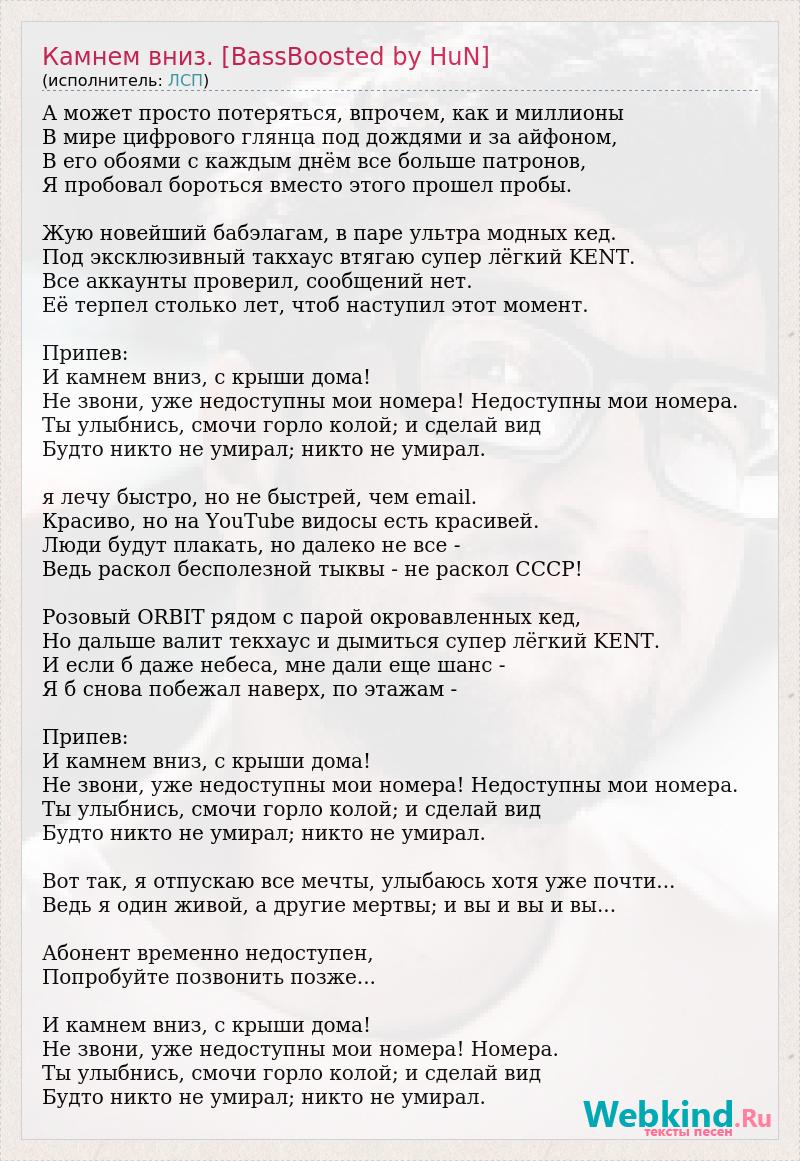 А может просто потеряться, впрочем, как и миллионы В мире цифрового глянца под дождями и за айфоном, В его обоями с каждым днём все больше патронов, Я пробовал бороться вместо этого прошел пробы. Жую новейший бабэлагам, в паре ультра модных кед. Под эксклюзивный такхаус втягаю супер лёгкий KENT. Все аккаунты проверил, сообщений нет. Её терпел столько лет, чтоб наступил этот момент. Припев: И камнем вниз, с крыши дома! Не звони, уже недоступны мои номера! Недоступны мои номера. Ты улыбнись, смочи горло колой; и сделай вид Будто никто не умирал; никто не умирал. я лечу быстро, но не быстрей, чем email. Красиво, но на YouTube видосы есть красивей. Люди будут плакать, но далеко не все - Ведь раскол бесполезной тыквы - не раскол СССР! Розовый ORBIT рядом с парой окровавленных кед, Но дальше валит текхаус и дымиться супер лёгкий KENT. И если б даже небеса, мне дали еще шанс - Я б снова побежал наверх, по этажам - Припев: И камнем вниз, с крыши дома! Не звони, уже недоступны мои номера! Недоступны мои номера. Ты улыбнись, смочи горло колой; и сделай вид Будто никто не умирал; никто не умирал. Вот так, я отпускаю все мечты, улыбаюсь хотя уже почти... Ведь я один живой, а другие мертвы; и вы и вы и вы... Абонент временно недоступен, Попробуйте позвонить позже... И камнем вниз, с крыши дома! Не звони, уже недоступны мои номера! Номера. Ты улыбнись, смочи горло колой; и сделай вид Будто никто не умирал; никто не умирал.