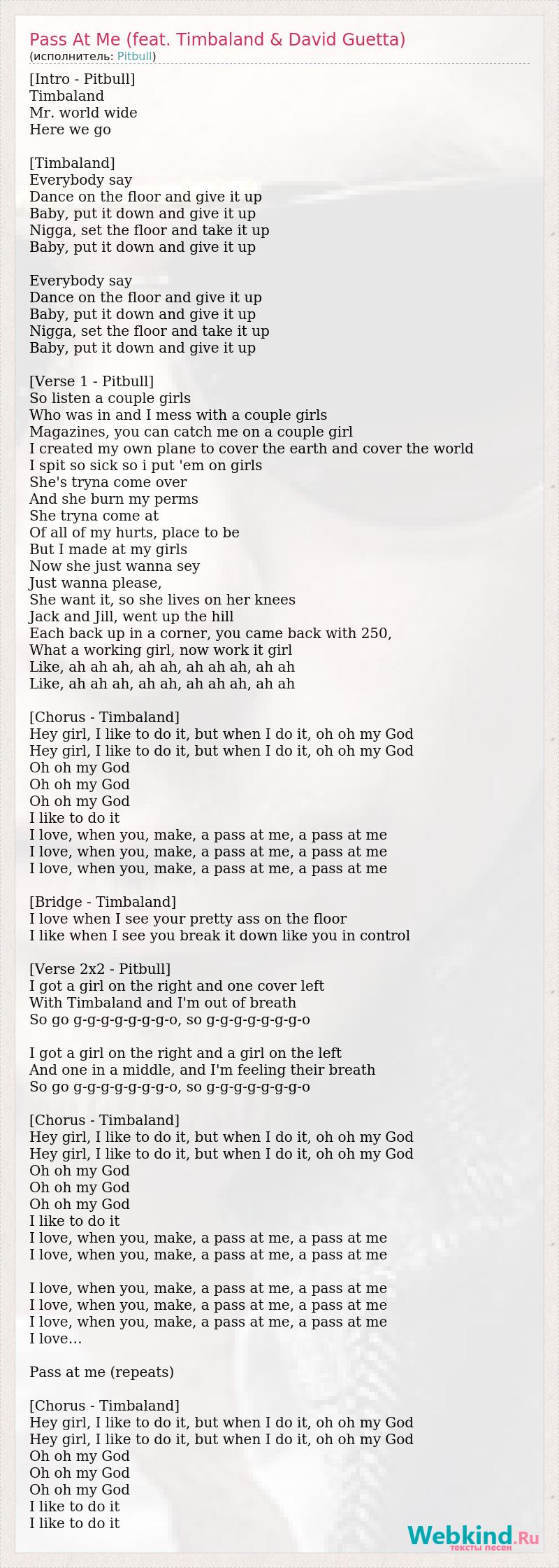 [Intro - Pitbull] Timbaland Mr. world wide Here we go [Timbaland] Everybody say Dance on the floor and give it up Baby, put it down and give it up Nigga, set the floor and take it up Baby, put it down and give it up Everybody say Dance on the floor and give it up Baby, put it down and give it up Nigga, set the floor and take it up Baby, put it down and give it up [Verse 1 - Pitbull] So listen a couple girls Who was in and I mess with a couple girls Magazines, you can catch me on a couple girl I created my own plane to cover the earth and cover the world I spit so sick so i put 'em on girls She's tryna come over And she burn my perms She tryna come at Of all of my hurts, place to be But I made at my girls Now she just wanna sey Just wanna please, She want it, so she lives on her knees Jack and Jill, went up the hill Each back up in a corner, you came back with 250, What a working girl, now work it girl Like, ah ah ah, ah ah, ah ah ah, ah ah Like, ah ah ah, ah ah, ah ah ah, ah ah [Chorus - Timbaland] Hey girl, I like to do it, but when I do it, oh oh my God Hey girl, I like to do it, but when I do it, oh oh my God Oh oh my God Oh oh my God Oh oh my God I like to do it I love, when you, make, a pass at me, a pass at me I love, when you, make, a pass at me, a pass at me I love, when you, make, a pass at me, a pass at me [Bridge - Timbaland] I love when I see your pretty ass on the floor I like when I see you break it down like you in control [Verse 2x2 - Pitbull] I got a girl on the right and one cover left With Timbaland and I'm out of breath So go g-g-g-g-g-g-g-o, so g-g-g-g-g-g-g-o I got a girl on the right and a girl on the left And one in a middle, and I'm feeling their breath So go g-g-g-g-g-g-g-o, so g-g-g-g-g-g-g-o [Chorus - Timbaland] Hey girl, I like to do it, but when I do it, oh oh my God Hey girl, I like to do it, but when I do it, oh oh my God Oh oh my God Oh oh my God Oh oh my God I like to do it I love, when you, make, a pass at me, a pass at me I love, when you, make, a pass at me, a pass at me I love, when you, make, a pass at me, a pass at me I love, when you, make, a pass at me, a pass at me I love, when you, make, a pass at me, a pass at me I love… Pass at me (repeats) [Chorus - Timbaland] Hey girl, I like to do it, but when I do it, oh oh my God Hey girl, I like to do it, but when I do it, oh oh my God Oh oh my God Oh oh my God Oh oh my God I like to do it I like to do it