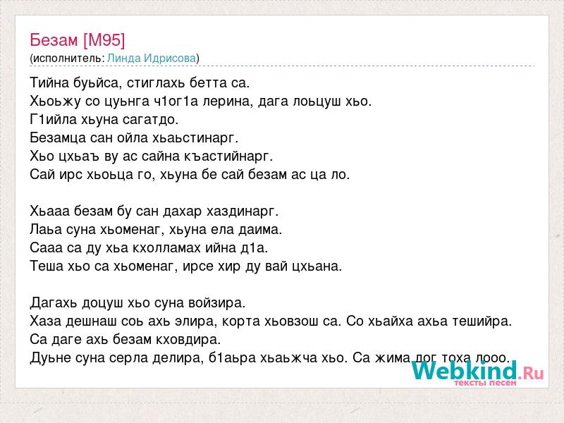 Тийна буьйса, стиглахь бетта са. Хьоьжу со цуьнга ч1ог1а лерина, дага лоьцуш хьо. Г1ийла хьуна сагатдо. Безамца сан ойла хьаьстинарг. Хьо цхьаъ ву ас сайна къастийнарг. Сай ирс хьоьца го, хьуна бе сай безам ас ца ло. Хьааа безам бу сан дахар хаздинарг. Лаьа суна хьоменаг, хьуна ела даима. Сааа са ду хьа кхолламах ийна д1а. Теша хьо са хьоменаг, ирсе хир ду вай цхьана. Дагахь доцуш хьо суна войзира. Хаза дешнаш соь ахь элира, корта хьовзош са. Со хьайха ахьа тешийра. Са даге ахь безам кховдира. Дуьне суна серла делира, б1аьра хьаьжча хьо. Са жима дог тоха лооо.