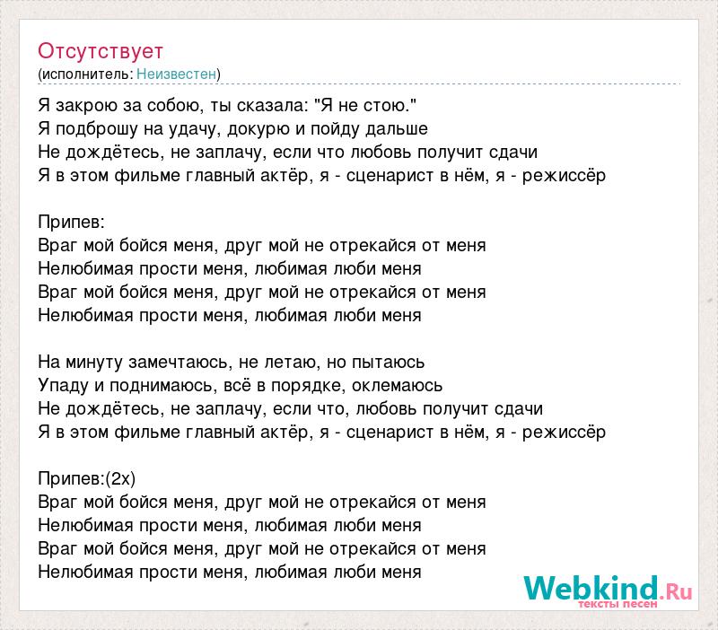 Я закрою за собою, ты сказала: "Я не стою." Я подброшу на удачу, докурю и пойду дальше Не дождётесь, не заплачу, если что любовь получит сдачи Я в этом фильме главный актёр, я - сценарист в нём, я - режиссёр Припев: Враг мой бойся меня, друг мой не отрекайся от меня Нелюбимая прости меня, любимая люби меня Враг мой бойся меня, друг мой не отрекайся от меня Нелюбимая прости меня, любимая люби меня На минуту замечтаюсь, не летаю, но пытаюсь Упаду и поднимаюсь, всё в порядке, оклемаюсь Не дождётесь, не заплачу, если что, любовь получит сдачи Я в этом фильме главный актёр, я - сценарист в нём, я - режиссёр Припев:(2х) Враг мой бойся меня, друг мой не отрекайся от меня Нелюбимая прости меня, любимая люби меня Враг мой бойся меня, друг мой не отрекайся от меня Нелюбимая прости меня, любимая люби меня