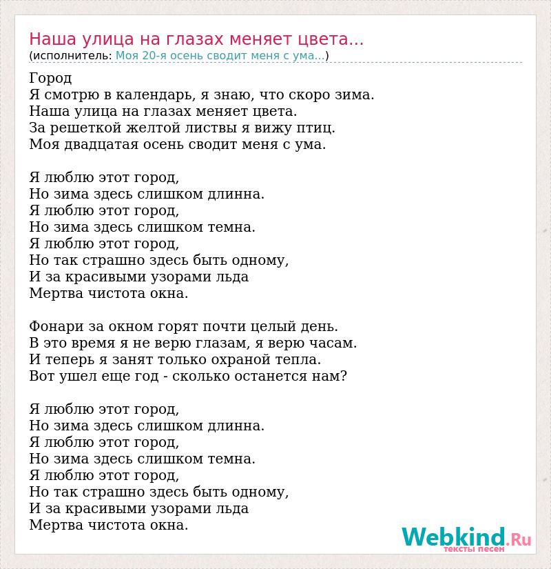 Город Я смотрю в календарь, я знаю, что скоро зима. Наша улица на глазах меняет цвета. За решеткой желтой листвы я вижу птиц. Моя двадцатая осень сводит меня с ума. Я люблю этот город, Но зима здесь слишком длинна. Я люблю этот город, Но зима здесь слишком темна. Я люблю этот город, Но так страшно здесь быть одному, И за красивыми узорами льда Мертва чистота окна. Фонари за окном горят почти целый день. В это время я не верю глазам, я верю часам. И теперь я занят только охраной тепла. Вот ушел еще год - сколько останется нам? Я люблю этот город, Но зима здесь слишком длинна. Я люблю этот город, Но зима здесь слишком темна. Я люблю этот город, Но так страшно здесь быть одному, И за красивыми узорами льда Мертва чистота окна.