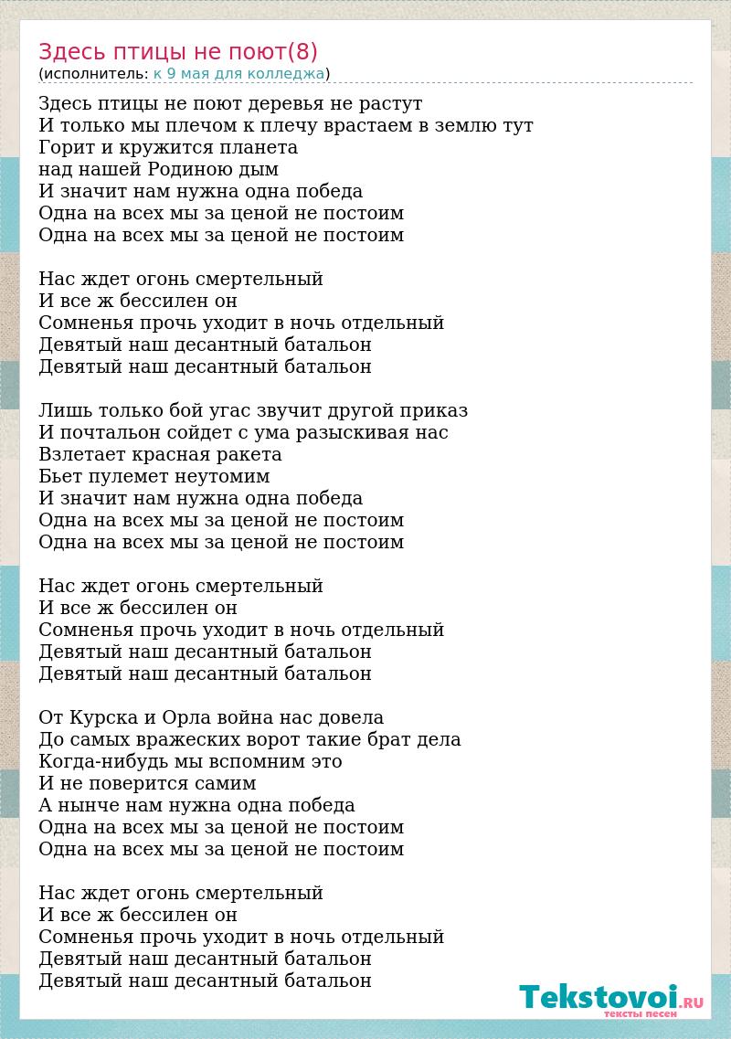 Здесь птицы не поют деревья не растут И только мы плечом к плечу врастаем в землю тут Горит и кружится планета над нашей Родиною дым И значит нам нужна одна победа Одна на всех мы за ценой не постоим Одна на всех мы за ценой не постоим Нас ждет огонь смертельный И все ж бессилен он Сомненья прочь уходит в ночь отдельный Девятый наш десантный батальон Девятый наш десантный батальон Лишь только бой угас звучит другой приказ И почтальон сойдет с ума разыскивая нас Взлетает красная ракета Бьет пулемет неутомим И значит нам нужна одна победа Одна на всех мы за ценой не постоим Одна на всех мы за ценой не постоим Нас ждет огонь смертельный И все ж бессилен он Сомненья прочь уходит в ночь отдельный Девятый наш десантный батальон Девятый наш десантный батальон От Курска и Орла война нас довела До самых вражеских ворот такие брат дела Когда-нибудь мы вспомним это И не поверится самим А нынче нам нужна одна победа Одна на всех мы за ценой не постоим Одна на всех мы за ценой не постоим Нас ждет огонь смертельный И все ж бессилен он Сомненья прочь уходит в ночь отдельный Девятый наш десантный батальон Девятый наш десантный батальон