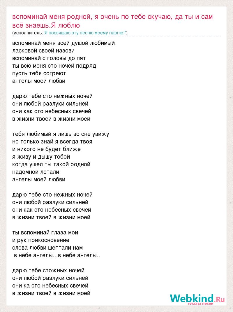 вспоминай меня всей душой любимый ласковой своей назови вспоминай с головы до пят ты всю меня сто ночей подряд пусть тебя согреют ангелы моей любви дарю тебе сто нежных ночей они любой разлуки сильней они как сто небесных свечей в жизни твоей в жизни моей тебя любимый я лишь во сне увижу но только знай я всегда твоя и никого не будет ближе я живу и дышу тобой когда ушел ты такой родной надомной летали ангелы моей любви дарю тебе сто нежных ночей они любой разлуки сильней они как сто небесных свечей в жизни твоей в жизни моей ты вспоминай глаза мои и рук прикосновение слова любви шептали нам в небе ангелы...в небе ангелы.. дарю тебе стожных ночей они любой разлуки сильней они ка сто небесных свечей в жизни твоей в жизни моей