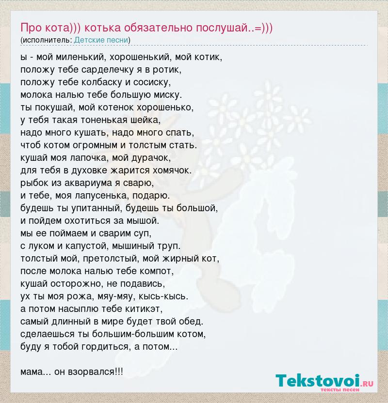 ы - мой миленький, хорошенький, мой котик, положу тебе сарделечку я в ротик, положу тебе колбаску и сосиску, молока налью тебе большую миску. ты покушай, мой котенок хорошенько, у тебя такая тоненькая шейка, надо много кушать, надо много спать, чтоб котом огромным и толстым стать. кушай моя лапочка, мой дурачок, для тебя в духовке жарится хомячок. рыбок из аквариума я сварю, и тебе, моя лапусенька, подарю. будешь ты упитанный, будешь ты большой, и пойдем охотиться за мышой. мы ее поймаем и сварим суп, с луком и капустой, мышиный труп. толстый мой, претолстый, мой жирный кот, после молока налью тебе компот, кушай осторожно, не подавись, ух ты моя рожа, мяу-мяу, кысь-кысь. а потом насыплю тебе китикэт, самый длинный в мире будет твой обед. сделаешься ты большим-большим котом, буду я тобой гордиться, а потом... мама... он взорвался!!!