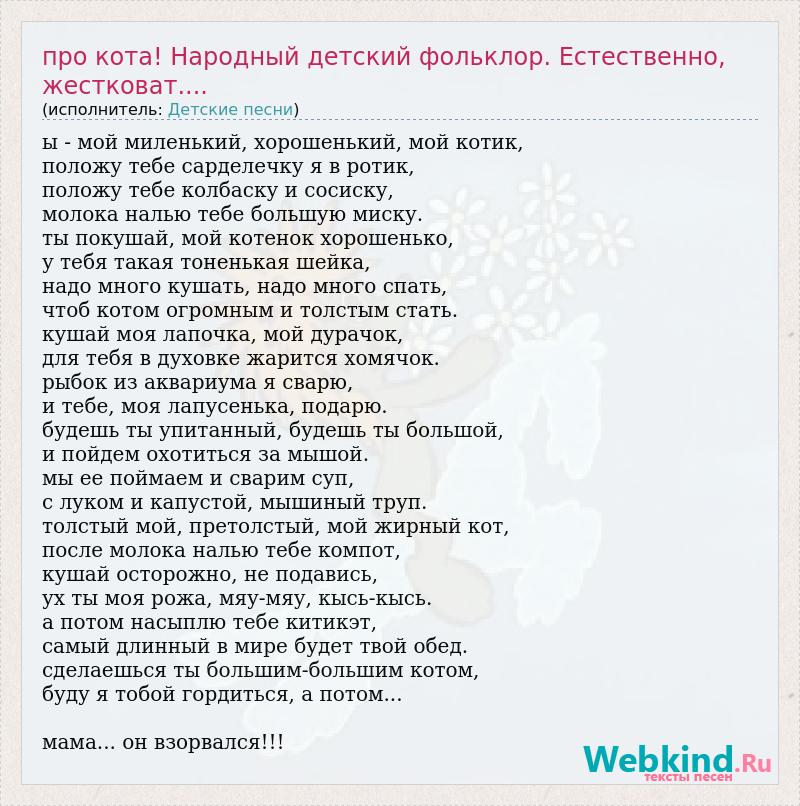 ы - мой миленький, хорошенький, мой котик, положу тебе сарделечку я в ротик, положу тебе колбаску и сосиску, молока налью тебе большую миску. ты покушай, мой котенок хорошенько, у тебя такая тоненькая шейка, надо много кушать, надо много спать, чтоб котом огромным и толстым стать. кушай моя лапочка, мой дурачок, для тебя в духовке жарится хомячок. рыбок из аквариума я сварю, и тебе, моя лапусенька, подарю. будешь ты упитанный, будешь ты большой, и пойдем охотиться за мышой. мы ее поймаем и сварим суп, с луком и капустой, мышиный труп. толстый мой, претолстый, мой жирный кот, после молока налью тебе компот, кушай осторожно, не подавись, ух ты моя рожа, мяу-мяу, кысь-кысь. а потом насыплю тебе китикэт, самый длинный в мире будет твой обед. сделаешься ты большим-большим котом, буду я тобой гордиться, а потом... мама... он взорвался!!!