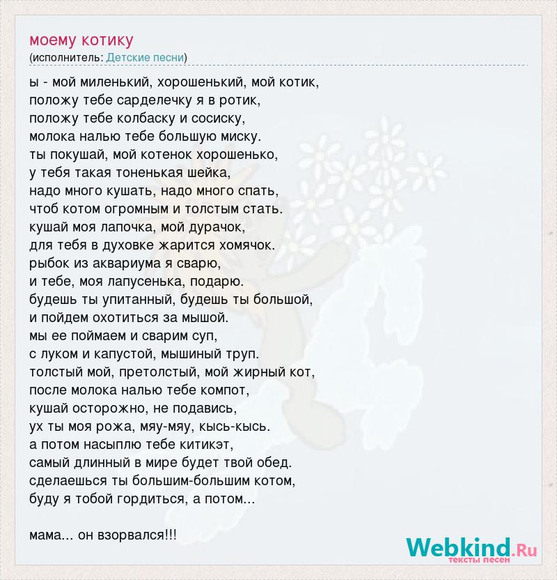 ы - мой миленький, хорошенький, мой котик, положу тебе сарделечку я в ротик, положу тебе колбаску и сосиску, молока налью тебе большую миску. ты покушай, мой котенок хорошенько, у тебя такая тоненькая шейка, надо много кушать, надо много спать, чтоб котом огромным и толстым стать. кушай моя лапочка, мой дурачок, для тебя в духовке жарится хомячок. рыбок из аквариума я сварю, и тебе, моя лапусенька, подарю. будешь ты упитанный, будешь ты большой, и пойдем охотиться за мышой. мы ее поймаем и сварим суп, с луком и капустой, мышиный труп. толстый мой, претолстый, мой жирный кот, после молока налью тебе компот, кушай осторожно, не подавись, ух ты моя рожа, мяу-мяу, кысь-кысь. а потом насыплю тебе китикэт, самый длинный в мире будет твой обед. сделаешься ты большим-большим котом, буду я тобой гордиться, а потом... мама... он взорвался!!!