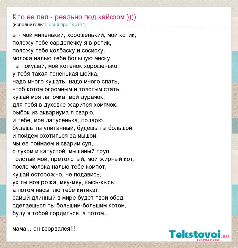 ы - мой миленький, хорошенький, мой котик, положу тебе сарделечку я в ротик, положу тебе колбаску и сосиску, молока налью тебе большую миску. ты покушай, мой котенок хорошенько, у тебя такая тоненькая шейка, надо много кушать, надо много спать, чтоб котом огромным и толстым стать. кушай моя лапочка, мой дурачок, для тебя в духовке жарится хомячок. рыбок из аквариума я сварю, и тебе, моя лапусенька, подарю. будешь ты упитанный, будешь ты большой, и пойдем охотиться за мышой. мы ее поймаем и сварим суп, с луком и капустой, мышиный труп. толстый мой, претолстый, мой жирный кот, после молока налью тебе компот, кушай осторожно, не подавись, ух ты моя рожа, мяу-мяу, кысь-кысь. а потом насыплю тебе китикэт, самый длинный в мире будет твой обед. сделаешься ты большим-большим котом, буду я тобой гордиться, а потом... мама... он взорвался!!!