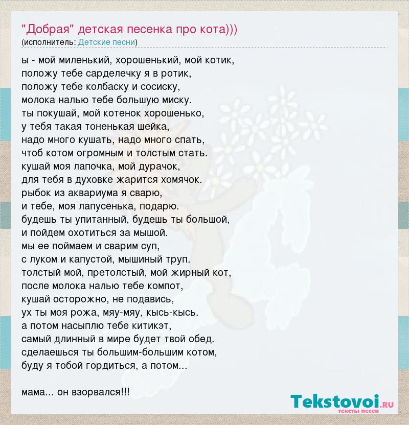 ы - мой миленький, хорошенький, мой котик, положу тебе сарделечку я в ротик, положу тебе колбаску и сосиску, молока налью тебе большую миску. ты покушай, мой котенок хорошенько, у тебя такая тоненькая шейка, надо много кушать, надо много спать, чтоб котом огромным и толстым стать. кушай моя лапочка, мой дурачок, для тебя в духовке жарится хомячок. рыбок из аквариума я сварю, и тебе, моя лапусенька, подарю. будешь ты упитанный, будешь ты большой, и пойдем охотиться за мышой. мы ее поймаем и сварим суп, с луком и капустой, мышиный труп. толстый мой, претолстый, мой жирный кот, после молока налью тебе компот, кушай осторожно, не подавись, ух ты моя рожа, мяу-мяу, кысь-кысь. а потом насыплю тебе китикэт, самый длинный в мире будет твой обед. сделаешься ты большим-большим котом, буду я тобой гордиться, а потом... мама... он взорвался!!!