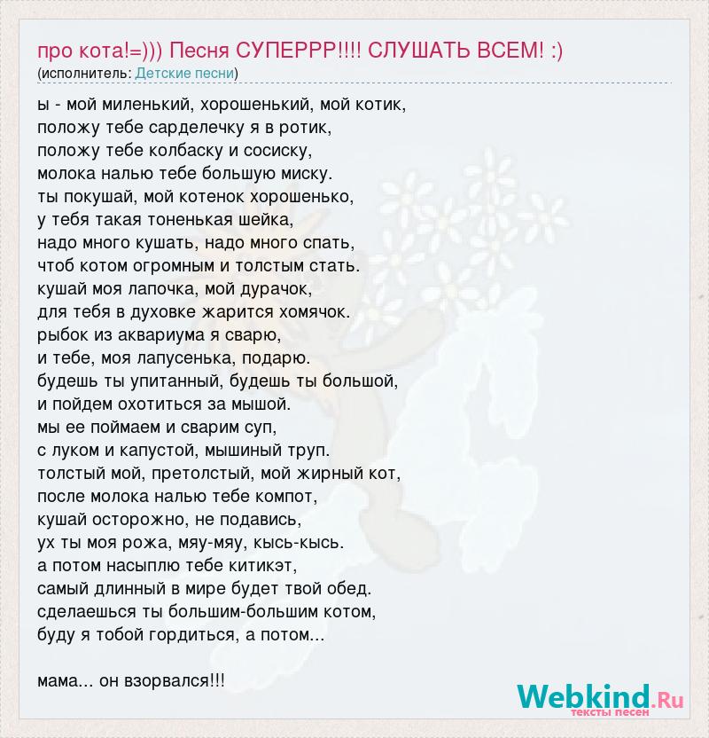 ы - мой миленький, хорошенький, мой котик, положу тебе сарделечку я в ротик, положу тебе колбаску и сосиску, молока налью тебе большую миску. ты покушай, мой котенок хорошенько, у тебя такая тоненькая шейка, надо много кушать, надо много спать, чтоб котом огромным и толстым стать. кушай моя лапочка, мой дурачок, для тебя в духовке жарится хомячок. рыбок из аквариума я сварю, и тебе, моя лапусенька, подарю. будешь ты упитанный, будешь ты большой, и пойдем охотиться за мышой. мы ее поймаем и сварим суп, с луком и капустой, мышиный труп. толстый мой, претолстый, мой жирный кот, после молока налью тебе компот, кушай осторожно, не подавись, ух ты моя рожа, мяу-мяу, кысь-кысь. а потом насыплю тебе китикэт, самый длинный в мире будет твой обед. сделаешься ты большим-большим котом, буду я тобой гордиться, а потом... мама... он взорвался!!!