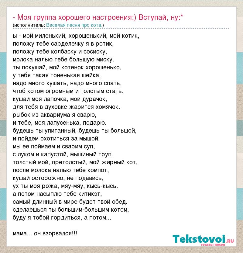 ы - мой миленький, хорошенький, мой котик, положу тебе сарделечку я в ротик, положу тебе колбаску и сосиску, молока налью тебе большую миску. ты покушай, мой котенок хорошенько, у тебя такая тоненькая шейка, надо много кушать, надо много спать, чтоб котом огромным и толстым стать. кушай моя лапочка, мой дурачок, для тебя в духовке жарится хомячок. рыбок из аквариума я сварю, и тебе, моя лапусенька, подарю. будешь ты упитанный, будешь ты большой, и пойдем охотиться за мышой. мы ее поймаем и сварим суп, с луком и капустой, мышиный труп. толстый мой, претолстый, мой жирный кот, после молока налью тебе компот, кушай осторожно, не подавись, ух ты моя рожа, мяу-мяу, кысь-кысь. а потом насыплю тебе китикэт, самый длинный в мире будет твой обед. сделаешься ты большим-большим котом, буду я тобой гордиться, а потом... мама... он взорвался!!!