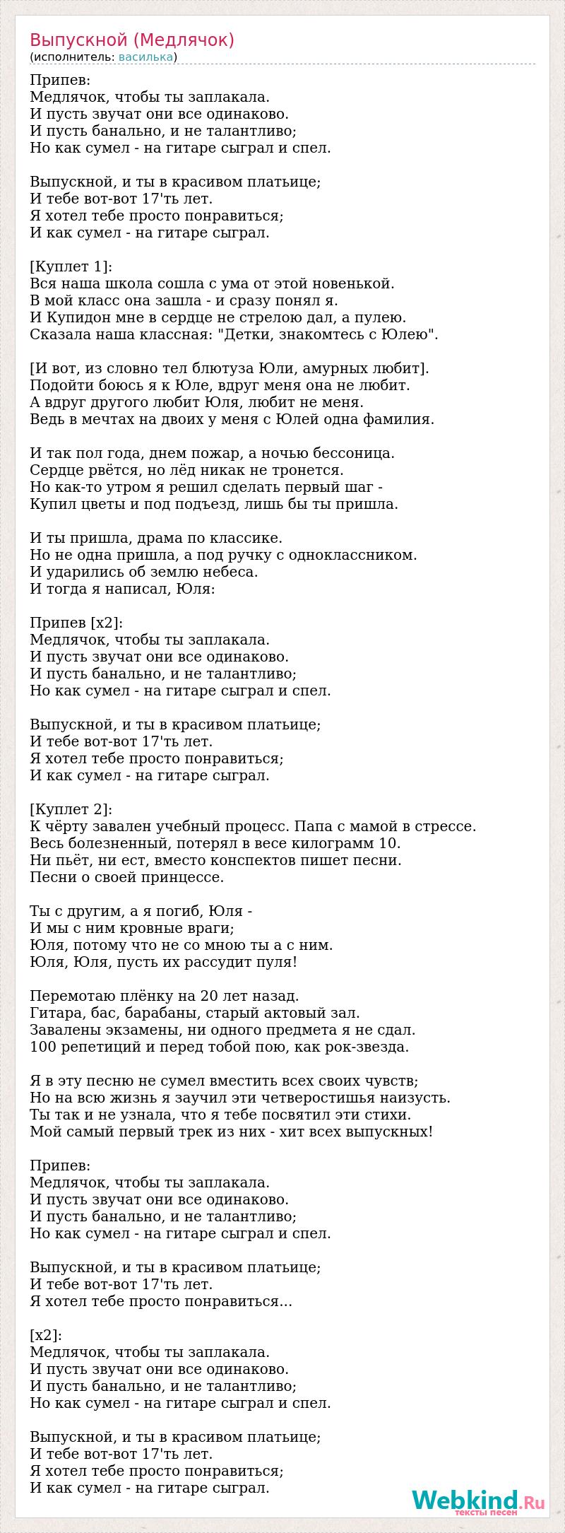 Припев: Медлячок, чтобы ты заплакала. И пусть звучат они все одинаково. И пусть банально, и не талантливо; Но как сумел - на гитаре сыграл и спел. Выпускной, и ты в красивом платьице; И тебе вот-вот 17'ть лет. Я хотел тебе просто понравиться; И как сумел - на гитаре сыграл. [Куплет 1]: Вся наша школа сошла с ума от этой новенькой. В мой класс она зашла - и сразу понял я. И Купидон мне в сердце не стрелою дал, а пулею. Сказала наша классная: "Детки, знакомтесь с Юлею". [И вот, из словно тел блютуза Юли, амурных любит]. Подойти боюсь я к Юле, вдруг меня она не любит. А вдруг другого любит Юля, любит не меня. Ведь в мечтах на двоих у меня с Юлей одна фамилия. И так пол года, днем пожар, а ночью бессоница. Сердце рвётся, но лёд никак не тронется. Но как-то утром я решил сделать первый шаг - Купил цветы и под подъезд, лишь бы ты пришла. И ты пришла, драма по классике. Но не одна пришла, а под ручку с одноклассником. И ударились об землю небеса. И тогда я написал, Юля: Припев [х2]: Медлячок, чтобы ты заплакала. И пусть звучат они все одинаково. И пусть банально, и не талантливо; Но как сумел - на гитаре сыграл и спел. Выпускной, и ты в красивом платьице; И тебе вот-вот 17'ть лет. Я хотел тебе просто понравиться; И как сумел - на гитаре сыграл. [Куплет 2]: К чёрту завален учебный процесс. Папа с мамой в стрессе. Весь болезненный, потерял в весе килограмм 10. Ни пьёт, ни ест, вместо конспектов пишет песни. Песни о своей принцессе. Ты с другим, а я погиб, Юля - И мы с ним кровные враги; Юля, потому что не со мною ты а с ним. Юля, Юля, пусть их рассудит пуля! Перемотаю плёнку на 20 лет назад. Гитара, бас, барабаны, старый актовый зал. Завалены экзамены, ни одного предмета я не сдал. 100 репетиций и перед тобой пою, как рок-звезда. Я в эту песню не сумел вместить всех своих чувств; Но на всю жизнь я заучил эти четверостишья наизусть. Ты так и не узнала, что я тебе посвятил эти стихи. Мой самый первый трек из них - хит всех выпускных! Припев: Медлячок, чтобы ты заплакала. И пусть звучат они все одинаково. И пусть банально, и не талантливо; Но как сумел - на гитаре сыграл и спел. Выпускной, и ты в красивом платьице; И тебе вот-вот 17'ть лет. Я хотел тебе просто понравиться... [x2]: Медлячок, чтобы ты заплакала. И пусть звучат они все одинаково. И пусть банально, и не талантливо; Но как сумел - на гитаре сыграл и спел. Выпускной, и ты в красивом платьице; И тебе вот-вот 17'ть лет. Я хотел тебе просто понравиться; И как сумел - на гитаре сыграл.