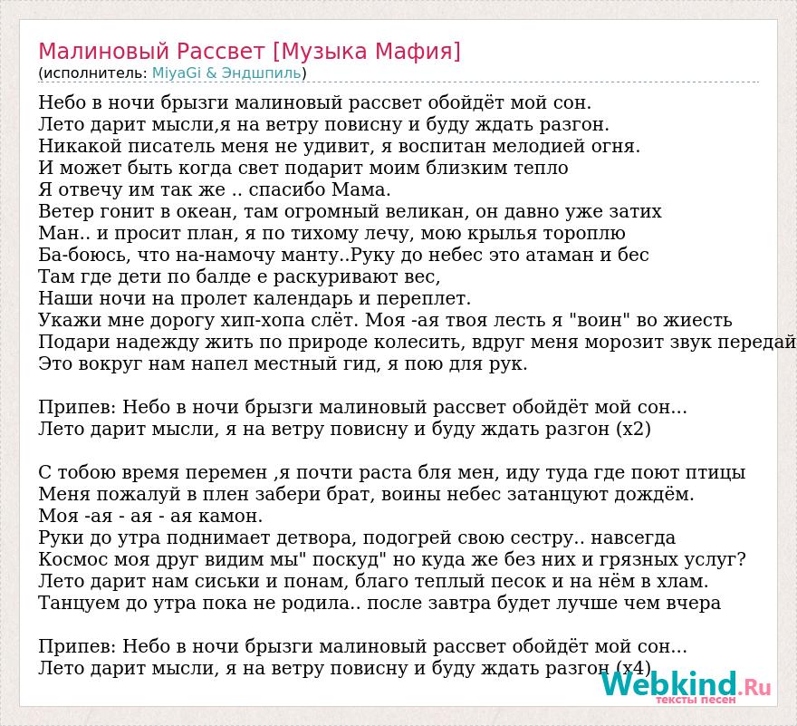 Небо в ночи брызги малиновый рассвет обойдёт мой сон. Лето дарит мысли,я на ветру повисну и буду ждать разгон. Никакой писатель меня не удивит, я воспитан мелодией огня. И может быть когда свет подарит моим близким тепло Я отвечу им так же .. спасибо Мама. Ветер гонит в океан, там огромный великан, он давно уже затих Ман.. и просит план, я по тихому лечу, мою крылья тороплю Ба-боюсь, что на-намочу манту..Руку до небес это атаман и бес Там где дети по балде е раскуривают вес, Наши ночи на пролет календарь и переплет. Укажи мне дорогу хип-хопа слёт. Моя -ая твоя лесть я "воин" во жиесть Подари надежду жить по природе колесить, вдруг меня морозит звук передай Это вокруг нам напел местный гид, я пою для рук. Припев: Небо в ночи брызги малиновый рассвет обойдёт мой сон... Лето дарит мысли, я на ветру повисну и буду ждать разгон (х2) С тобою время перемен ,я почти раста бля мен, иду туда где поют птицы Меня пожалуй в плен забери брат, воины небес затанцуют дождём. Моя -ая - ая - ая камон. Руки до утра поднимает детвора, подогрей свою сестру.. навсегда Космос моя друг видим мы" поскуд" но куда же без них и грязных услуг? Лето дарит нам сиськи и понам, благо теплый песок и на нём в хлам. Танцуем до утра пока не родила.. после завтра будет лучше чем вчера Припев: Небо в ночи брызги малиновый рассвет обойдёт мой сон... Лето дарит мысли, я на ветру повисну и буду ждать разгон (х4)