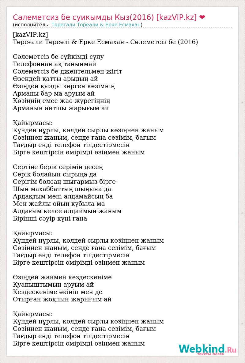 [kazVIP.kz] Төреғали Төреәлі & Ерке Есмахан - Сәлеметсіз бе (2016) Сәлеметсіз бе сүйкімді сұлу Телефоннан ақ танынмай Сәлеметсіз бе джентельмен жігіт Өзендей қатты арыдың ай Өзіңдей қызды көрген көзімнің Арманы бар ма аруым ай Көзіңнің емес жас жүрегіңнің Арманын айтшы жарығым ай Қайырмасы: Күндей нұрлы, көлдей сырлы көзіңнен жаным Сөзіңнен жаным, сенде ғана сезімім, бағым Тағдыр енді телефон тілдестірмесін Бірге кештірсін өмірімді өзіңмен жаным Сертіңе берік серімін десең Серік болайын сырыңа да Серігім болсаң шығармыз бірге Шын махаббаттың шыңына да Ардақтым мені алдамайсың ба Мен жайлы ойың құбыла ма Алдағым келсе алдаймын жаным Бірінші сәуір күні ғана Қайырмасы: Күндей нұрлы, көлдей сырлы көзіңнен жаным Сөзіңнен жаным, сенде ғана сезімім, бағым Тағдыр енді телефон тілдестірмесін Бірге кештірсін өмірімді өзіңмен жаным Өзіңдей жанмен кездескеніме Қуаныштымын аруым ай Кездескеніме өкініп мен де Отырған жоқпын жарығым ай Қайырмасы: Күндей нұрлы, көлдей сырлы көзіңнен жаным Сөзіңнен жаным, сенде ғана сезімім, бағым Тағдыр енді телефон тілдестірмесін Бірге кештірсін өмірімді өзіңмен жаным