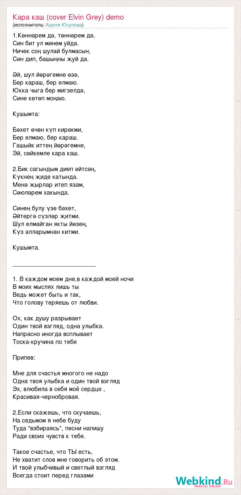 1.Көннәрем дә, төннәрем дә, Син бит ул минем уйда. Ничек соң шулай булмасын, Син дип, башыңны җуй да. Әй, шул йөрәгемне өзә, Бер караш, бер елмаю. Юкка чыга бер мигзелдә, Сине көтөп моңаю. Кушымта: Бәхет өчөн күп кирәкми, Бер елмаю, бер караш. Гашыйк иттең йөрәгемне, Эй, сөйкемле кара каш. 2.Бик сагындым диеп әйтсәң, Күкнең җиде катында. Менә җырлар итеп язам, Сөюләрем хакында. Синең булу үзе бәхет, Әйтергә сүзләр җитми. Шул елмайган якты йөзең, Күз алларымнан китми. Кушымта. _________________________ 1. В каждом моем дне,в каждой моей ночи В моих мыслях лишь ты Ведь может быть и так, Что голову теряешь от любви. Ох, как душу разрывает Один твой взгляд, одна улыбка. Напрасно иногда всплывает Тоска-кручина по тебе Припев: Мне для счастья многого не надо Одна твоя улыбка и один твой взгляд Эх, влюбила в себя моё сердце , Красивая-чернобровая. 2.Если скажешь, что скучаешь, На седьмом я небе буду Туда "взбираясь", песни напишу Ради своих чувств к тебе. Такое счастье, что ТЫ есть, Не хватит слов мне говорить об этом. И твой улыбчивый и светлый взгляд Всегда стоит перед глазами