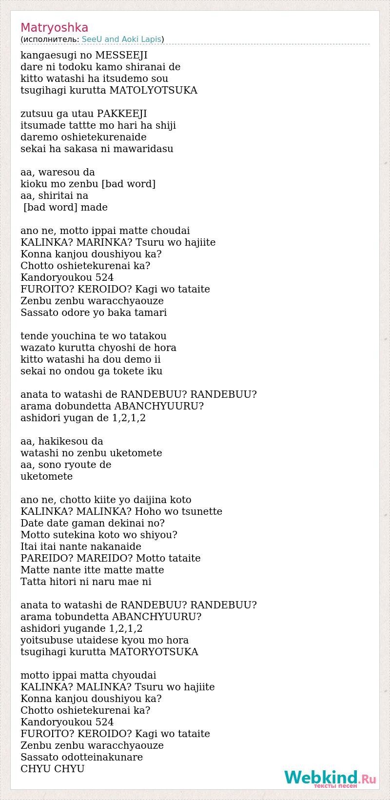 kangaesugi no MESSEEJI dare ni todoku kamo shiranai de kitto watashi ha itsudemo sou tsugihagi kurutta MATOLYOTSUKA zutsuu ga utau PAKKEEJI itsumade tattte mo hari ha shiji daremo oshietekurenaide sekai ha sakasa ni mawaridasu aa, waresou da kioku mo zenbu [bad word] aa, shiritai na [bad word] made ano ne, motto ippai matte choudai KALINKA? MARINKA? Tsuru wo hajiite Konna kanjou doushiyou ka? Chotto oshietekurenai ka? Kandoryoukou 524 FUROITO? KEROIDO? Kagi wo tataite Zenbu zenbu waracchyaouze Sassato odore yo baka tamari tende youchina te wo tatakou wazato kurutta chyoshi de hora kitto watashi ha dou demo ii sekai no ondou ga tokete iku anata to watashi de RANDEBUU? RANDEBUU? arama dobundetta ABANCHYUURU? ashidori yugan de 1,2,1,2 aa, hakikesou da watashi no zenbu uketomete aa, sono ryoute de uketomete ano ne, chotto kiite yo daijina koto KALINKA? MALINKA? Hoho wo tsunette Date date gaman dekinai no? Motto sutekina koto wo shiyou? Itai itai nante nakanaide PAREIDO? MAREIDO? Motto tataite Matte nante itte matte matte Tatta hitori ni naru mae ni anata to watashi de RANDEBUU? RANDEBUU? arama tobundetta ABANCHYUURU? ashidori yugande 1,2,1,2 yoitsubuse utaidese kyou mo hora tsugihagi kurutta MATORYOTSUKA motto ippai matta chyoudai KALINKA? MALINKA? Tsuru wo hajiite Konna kanjou doushiyou ka? Chotto oshietekurenai ka? Kandoryoukou 524 FUROITO? KEROIDO? Kagi wo tataite Zenbu zenbu waracchyaouze Sassato odotteinakunare CHYU CHYU