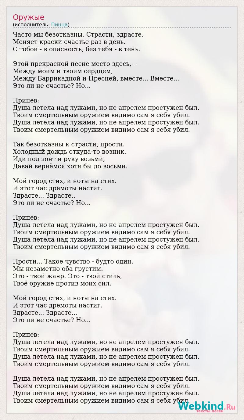 Часто мы безотказны. Страсти, здрасте. Меняет краски счастье раз в день. С тобой - в опасность, без тебя - в тень. Этой прекрасной песне место здесь, - Между моим и твоим сердцем, Между Баррикадной и Пресней, вместе... Вместе... Это ли не счастье? Но... Припев: Душа летела над лужами, но не апрелем простужен был. Твоим смертельным оружием видимо сам я себя убил. Душа летела над лужами, но не апрелем простужен был. Твоим смертельным оружием видимо сам я себя убил. Так безотказны к страсти, прости. Холодный дождь откуда-то возник. Иди под зонт и руку возьми, Давай вернёмся хотя бы до восьми. Мой город стих, и ноты на стих. И этот час дремоты настиг. Здрасте... Здрасте.. Это ли не счастье? Но... Припев: Душа летела над лужами, но не апрелем простужен был. Твоим смертельным оружием видимо сам я себя убил. Душа летела над лужами, но не апрелем простужен был. Твоим смертельным оружием видимо сам я себя убил. Прости... Такое чувство - будто один. Мы незаметно оба грустим. Это - твой жанр. Это - твой стиль, Твоё оружие против моих сил. Мой город стих, и ноты на стих. И этот час дремоты настиг. Здрасте... Здрасте... Это ли не счастье? Но... Припев: Душа летела над лужами, но не апрелем простужен был. Твоим смертельным оружием видимо сам я себя убил. Душа летела над лужами, но не апрелем простужен был. Твоим смертельным оружием видимо сам я себя убил. Душа летела над лужами, но не апрелем простужен был. Твоим смертельным оружием видимо сам я себя убил. Душа летела над лужами, но не апрелем простужен был. Твоим смертельным оружием видимо сам я себя убил.