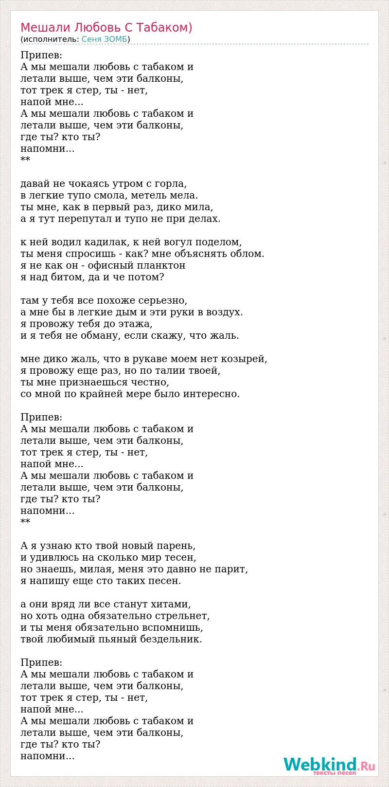 Припев: А мы мешали любовь с табаком и летали выше, чем эти балконы, тот трек я стер, ты - нет, напой мне... А мы мешали любовь с табаком и летали выше, чем эти балконы, где ты? кто ты? напомни... ** давай не чокаясь утром с горла, в легкие тупо смола, метель мела. ты мне, как в первый раз, дико мила, а я тут перепутал и тупо не при делах. к ней водил кадилак, к ней вогул поделом, ты меня спросишь - как? мне объяснять облом. я не как он - офисный планктон я над битом, да и че потом? там у тебя все похоже серьезно, а мне бы в легкие дым и эти руки в воздух. я провожу тебя до этажа, и я тебя не обману, если скажу, что жаль. мне дико жаль, что в рукаве моем нет козырей, я провожу еще раз, но по талии твоей, ты мне признаешься честно, со мной по крайней мере было интересно. Припев: А мы мешали любовь с табаком и летали выше, чем эти балконы, тот трек я стер, ты - нет, напой мне... А мы мешали любовь с табаком и летали выше, чем эти балконы, где ты? кто ты? напомни... ** А я узнаю кто твой новый парень, и удивлюсь на сколько мир тесен, но знаешь, милая, меня это давно не парит, я напишу еще сто таких песен. а они вряд ли все станут хитами, но хоть одна обязательно стрельнет, и ты меня обязательно вспомнишь, твой любимый пьяный бездельник. Припев: А мы мешали любовь с табаком и летали выше, чем эти балконы, тот трек я стер, ты - нет, напой мне... А мы мешали любовь с табаком и летали выше, чем эти балконы, где ты? кто ты? напомни...