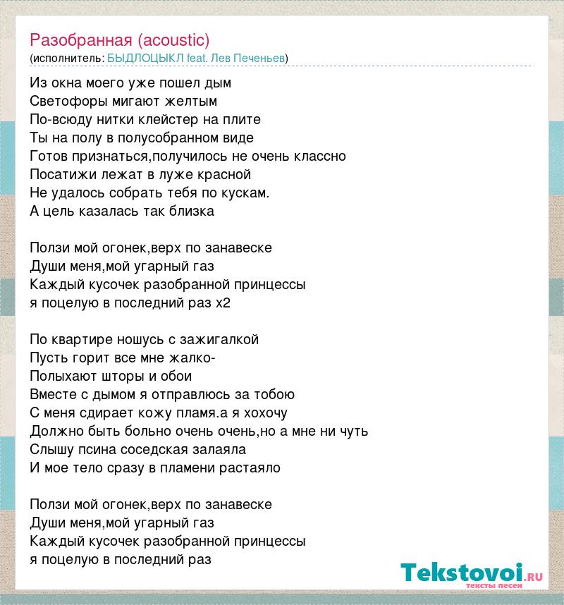 Из окна моего уже пошел дым Светофоры мигают желтым По-всюду нитки клейстер на плите Ты на полу в полусобранном виде Готов признаться,получилось не очень классно Посатижи лежат в луже красной Не удалось собрать тебя по кускам. А цель казалась так близка Ползи мой огонек,верх по занавеске Души меня,мой угарный газ Каждый кусочек разобранной принцессы я поцелую в последний раз х2 По квартире ношусь с зажигалкой Пусть горит все мне жалко- Полыхают шторы и обои Вместе с дымом я отправлюсь за тобою С меня сдирает кожу пламя.а я хохочу Должно быть больно очень очень,но а мне ни чуть Слышу псина соседская залаяла И мое тело сразу в пламени растаяло Ползи мой огонек,верх по занавеске Души меня,мой угарный газ Каждый кусочек разобранной принцессы я поцелую в последний раз