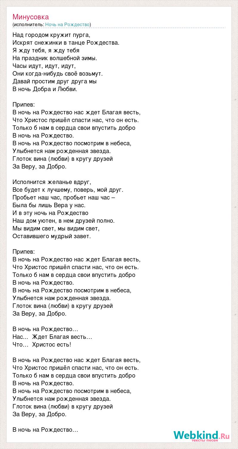 Над городом кружит пурга, Искрят снежинки в танце Рождества. Я жду тебя, я жду тебя На праздник волшебной зимы. Часы идут, идут, идут, Они когда-нибудь своё возьмут. Давай простим друг друга мы В ночь Добра и Любви. Припев: В ночь на Рождество нас ждет Благая весть, Что Христос пришёл спасти нас, что он есть. Только б нам в сердца свои впустить добро В ночь на Рождество. В ночь на Рождество посмотрим в небеса, Улыбнется нам рожденная звезда. Глоток вина (любви) в кругу друзей За Веру, за Добро. Исполнится желанье вдруг, Все будет к лучшему, поверь, мой друг. Пробьет наш час, пробьет наш час – Была бы лишь Вера у нас. И в эту ночь на Рождество Наш дом уютен, в нем друзей полно. Мы видим свет, мы видим свет, Оставившего мудрый завет. Припев: В ночь на Рождество нас ждет Благая весть, Что Христос пришёл спасти нас, что он есть. Только б нам в сердца свои впустить добро В ночь на Рождество. В ночь на Рождество посмотрим в небеса, Улыбнется нам рожденная звезда. Глоток вина (любви) в кругу друзей За Веру, за Добро. В ночь на Рождество… Нас... Ждет Благая весть… Что… Христос есть! В ночь на Рождество нас ждет Благая весть, Что Христос пришёл спасти нас, что он есть. Только б нам в сердца свои впустить добро В ночь на Рождество. В ночь на Рождество посмотрим в небеса, Улыбнется нам рожденная звезда. Глоток вина (любви) в кругу друзей За Веру, за Добро. В ночь на Рождество…