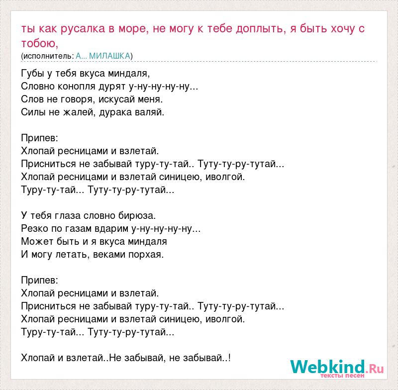Главная→Исполнители→А... МИЛАШКА→Ты как русалка в море, не могу к тебе доплыть, я быть хочу с тобою,