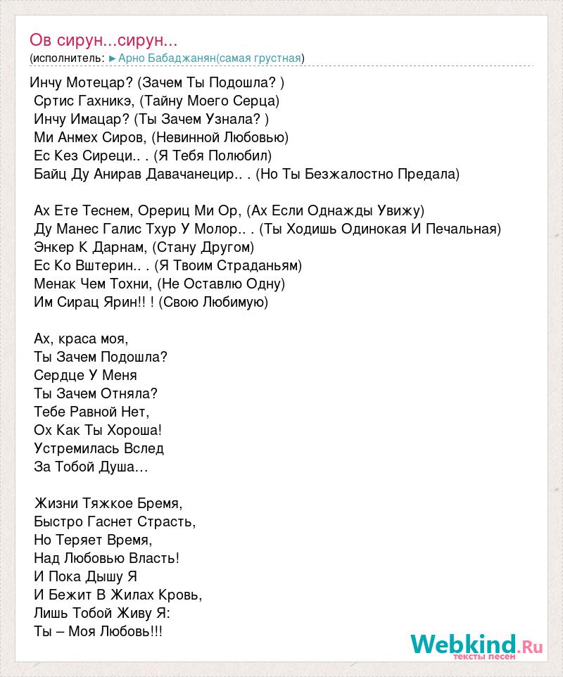 Инчу Мотецар? (Зачем Ты Подошла? ) Сртис Гахникэ, (Тайну Моего Серца) Инчу Имацар? (Ты Зачем Узнала? ) Ми Анмех Сиров, (Невинной Любовью) Ес Кез Сиреци.. . (Я Тебя Полюбил) Байц Ду Анирав Давачанецир.. . (Но Ты Безжалостно Предала) Ах Ете Теснем, Орериц Ми Ор, (Ах Если Однажды Увижу) Ду Манес Галис Тхур У Молор.. . (Ты Ходишь Одинокая И Печальная) Энкер К Дарнам, (Стану Другом) Ес Ко Вштерин.. . (Я Твоим Страданьям) Менак Чем Тохни, (Не Оставлю Одну) Им Сирац Ярин!! ! (Свою Любимую) Ах, краса моя, Ты Зачем Подошла? Сердце У Меня Ты Зачем Отняла? Тебе Равной Нет, Ох Как Ты Хороша! Устремилась Вслед За Тобой Душа… Жизни Тяжкое Бремя, Быстро Гаснет Страсть, Но Теряет Время, Над Любовью Власть! И Пока Дышу Я И Бежит В Жилах Кровь, Лишь Тобой Живу Я: Ты – Моя Любовь!!!
