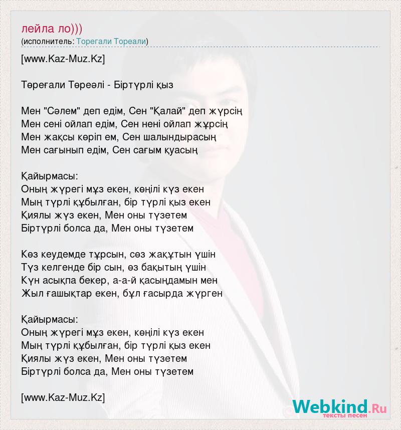 [www.Kaz-Muz.Kz] Төреғали Төреәлі - Біртүрлі қыз Мен "Сәлем" деп едім, Сен "Қалай" деп жүрсің Мен сені ойлап едім, Сен нені ойлап жұрсің Мен жақсы көріп ем, Сен шалындырасың Мен сағынып едім, Сен сағым қуасың Қайырмасы: Оның жүрегі мұз екен, көңілі күз екен Мың түрлі құбылған, бір түрлі қыз екен Қиялы жүз екен, Мен оны түзетем Біртүрлі болса да, Мен оны түзетем Көз кеудемде тұрсын, сөз жақұтын үшін Түз келгенде бір сын, өз бақытың үшін Күн асықпа бекер, а-а-й қасыңдамын мен Жыл ғашықтар екен, бұл ғасырда жүрген Қайырмасы: Оның жүрегі мұз екен, көңілі күз екен Мың түрлі құбылған, бір түрлі қыз екен Қиялы жүз екен, Мен оны түзетем Біртүрлі болса да, Мен оны түзетем [www.Kaz-Muz.Kz]