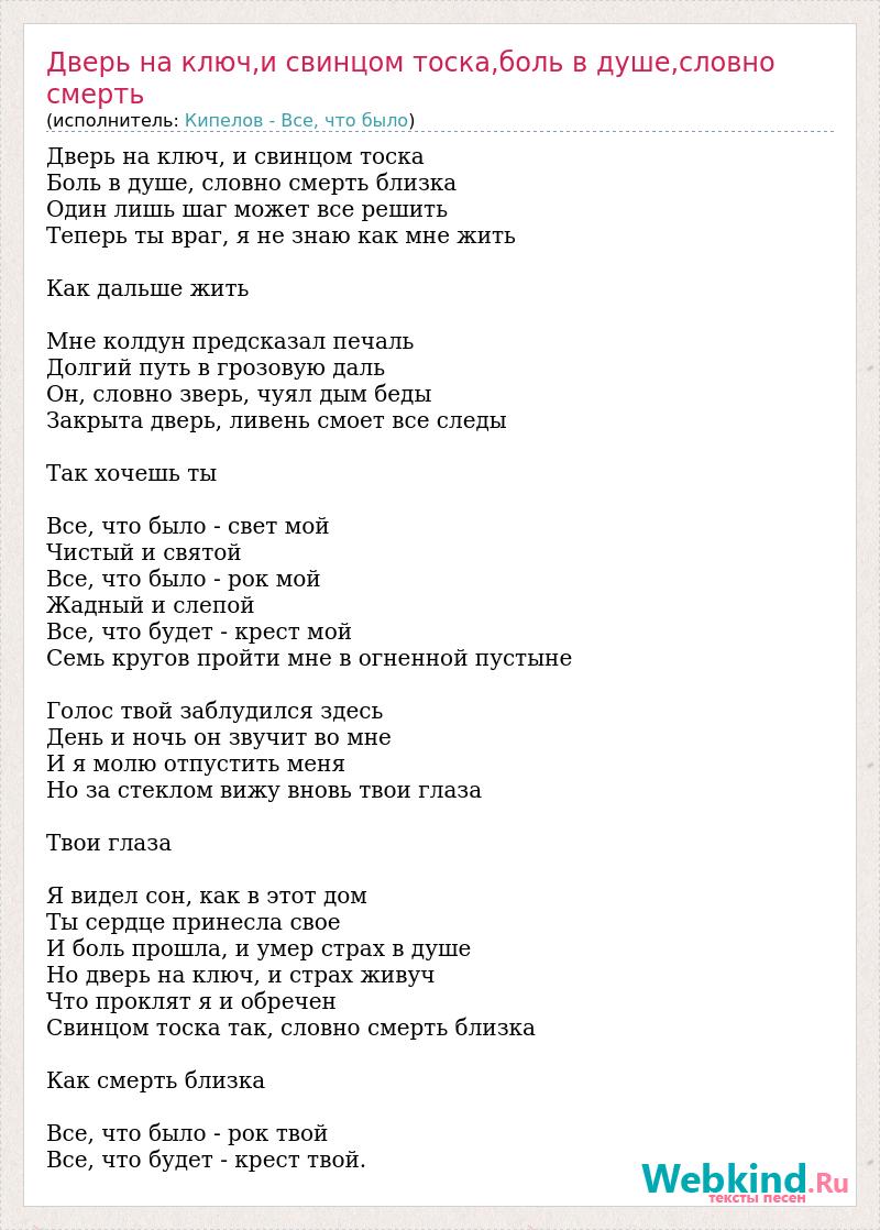 Дверь на ключ, и свинцом тоска Боль в душе, словно смерть близка Один лишь шаг может все решить Теперь ты враг, я не знаю как мне жить Как дальше жить Мне колдун предсказал печаль Долгий путь в грозовую даль Он, словно зверь, чуял дым беды Закрыта дверь, ливень смоет все следы Так хочешь ты Все, что было - свет мой Чистый и святой Все, что было - рок мой Жадный и слепой Все, что будет - крест мой Семь кругов пройти мне в огненной пустыне Голос твой заблудился здесь День и ночь он звучит во мне И я молю отпустить меня Но за стеклом вижу вновь твои глаза Твои глаза Я видел сон, как в этот дом Ты сердце принесла свое И боль прошла, и умер страх в душе Но дверь на ключ, и страх живуч Что проклят я и обречен Свинцом тоска так, словно смерть близка Как смерть близка Все, что было - рок твой Все, что будет - крест твой.