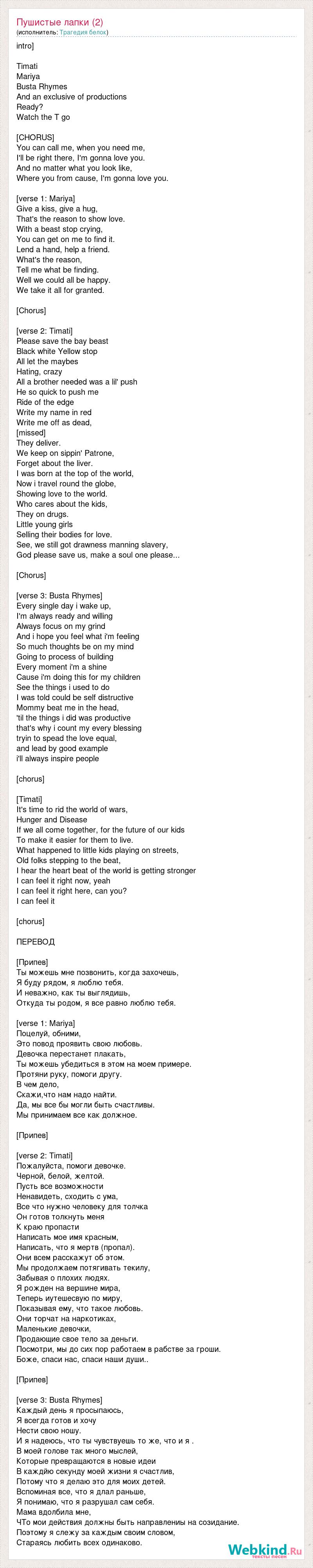 intro] Timati Mariya Busta Rhymes And an exclusive of productions Ready? Watch the T go [CHORUS] You can call me, when you need me, I'll be right there, I'm gonna love you. And no matter what you look like, Where you from cause, I'm gonna love you. [verse 1: Mariya] Give a kiss, give a hug, That's the reason to show love. With a beast stop crying, You can get on me to find it. Lend a hand, help a friend. What's the reason, Tell me what be finding. Well we could all be happy. We take it all for granted. [Chorus] [verse 2: Timati] Please save the bay beast Black white Yellow stop All let the maybes Hating, crazy All a brother needed was a lil' push He so quick to push me Ride of the edge Write my name in red Write me off as dead, [missed] They deliver. We keep on sippin' Patrone, Forget about the liver. I was born at the top of the world, Now i travel round the globe, Showing love to the world. Who cares about the kids, They on drugs. Little young girls Selling their bodies for love. See, we still got drawness manning slavery, God please save us, make a soul one please... [Chorus] [verse 3: Busta Rhymes] Every single day i wake up, I'm always ready and willing Always focus on my grind And i hope you feel what i'm feeling So much thoughts be on my mind Going to process of building Every moment i'm a shine Cause i'm doing this for my children See the things i used to do I was told could be self distructive Mommy beat me in the head, 'til the things i did was productive that's why i count my every blessing tryin to spead the love equal, and lead by good example i'll always inspire people [chorus] [Timati] It's time to rid the world of wars, Hunger and Disease If we all come together, for the future of our kids To make it easier for them to live. What happened to little kids playing on streets, Old folks stepping to the beat, I hear the heart beat of the world is getting stronger I can feel it right now, yeah I can feel it right here, can you? I can feel it [chorus] ПЕРЕВОД [Припев] Ты можешь мне позвонить, когда захочешь, Я буду рядом, я люблю тебя. И неважно, как ты выглядишь, Откуда ты родом, я все равно люблю тебя. [verse 1: Mariya] Поцелуй, обними, Это повод проявить свою любовь. Девочка перестанет плакать, Ты можешь убедиться в этом на моем примере. Протяни руку, помоги другу. В чем дело, Скажи,что нам надо найти. Да, мы все бы могли быть счастливы. Мы принимаем все как должное. [Припев] [verse 2: Timati] Пожалуйста, помоги девочке. Черной, белой, желтой. Пусть все возможности Ненавидеть, сходить с ума, Все что нужно человеку для толчка Он готов толкнуть меня К краю пропасти Написать мое имя красным, Написать, что я мертв (пропал). Они всем расскажут об этом. Мы продолжаем потягивать текилу, Забывая о плохих людях. Я рожден на вершине мира, Теперь иутешесвую по миру, Показывая ему, что такое любовь. Они торчат на наркотиках, Маленькие девочки, Продающие свое тело за деньги. Посмотри, мы до сих пор работаем в рабстве за гроши. Боже, спаси нас, спаси наши души.. [Припев] [verse 3: Busta Rhymes] Каждый день я просыпаюсь, Я всегда готов и хочу Нести свою ношу. И я надеюсь, что ты чувствуешь то же, что и я . В моей голове так много мыслей, Которые превращаются в новые идеи В каждйю секунду моей жизни я счастлив, Потому что я делаю это для моих детей. Вспоминая все, что я длал раньше, Я понимаю, что я разрушал сам себя. Мама вдолбила мне, ЧТо мои действия должны быть направлениы на созидание. Поэтому я слежу за каждым своим словом, Стараясь любить всех одинаково.