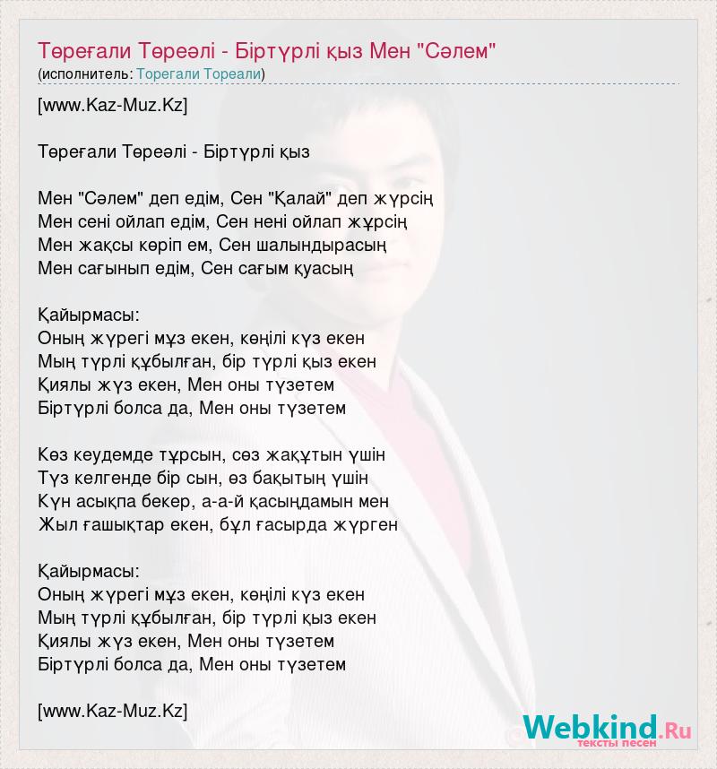 [www.Kaz-Muz.Kz] Төреғали Төреәлі - Біртүрлі қыз Мен "Сәлем" деп едім, Сен "Қалай" деп жүрсің Мен сені ойлап едім, Сен нені ойлап жұрсің Мен жақсы көріп ем, Сен шалындырасың Мен сағынып едім, Сен сағым қуасың Қайырмасы: Оның жүрегі мұз екен, көңілі күз екен Мың түрлі құбылған, бір түрлі қыз екен Қиялы жүз екен, Мен оны түзетем Біртүрлі болса да, Мен оны түзетем Көз кеудемде тұрсын, сөз жақұтын үшін Түз келгенде бір сын, өз бақытың үшін Күн асықпа бекер, а-а-й қасыңдамын мен Жыл ғашықтар екен, бұл ғасырда жүрген Қайырмасы: Оның жүрегі мұз екен, көңілі күз екен Мың түрлі құбылған, бір түрлі қыз екен Қиялы жүз екен, Мен оны түзетем Біртүрлі болса да, Мен оны түзетем [www.Kaz-Muz.Kz]